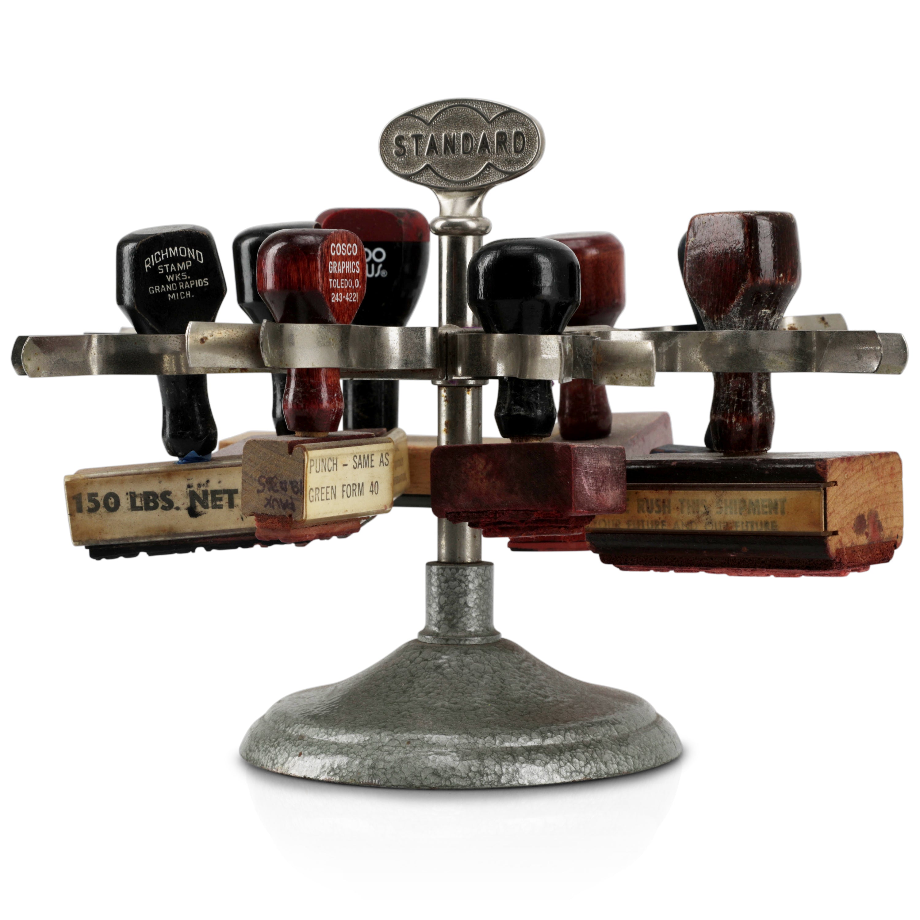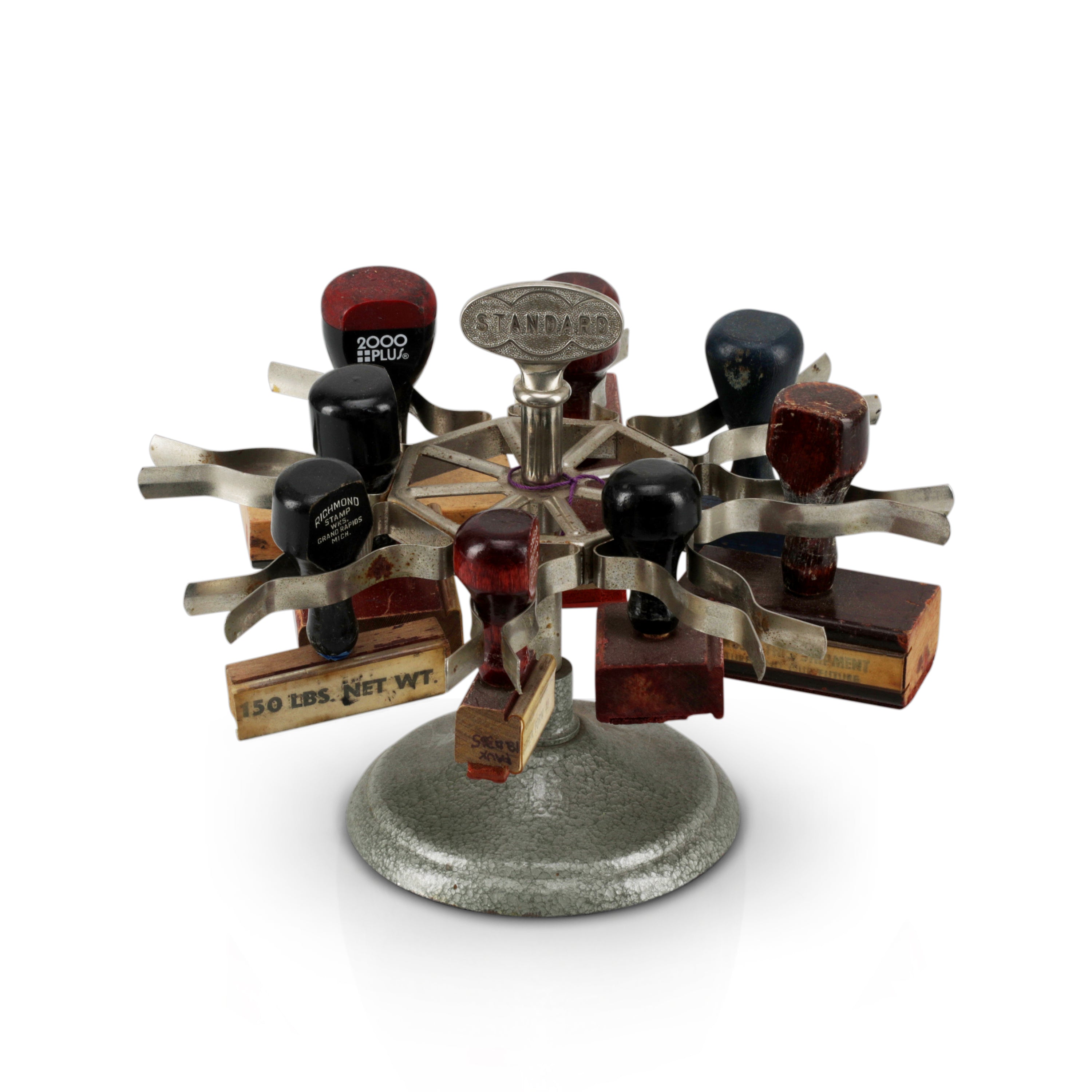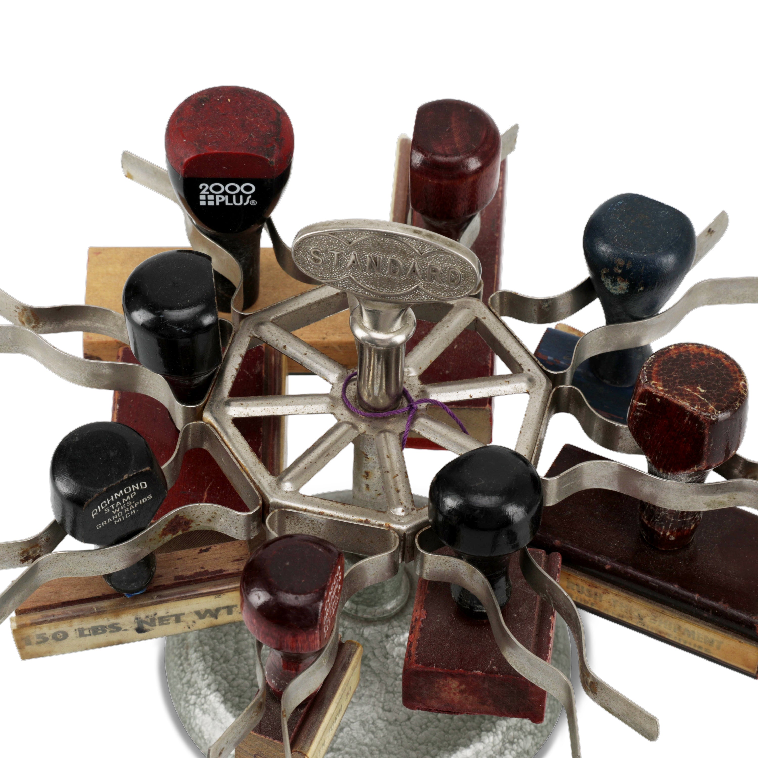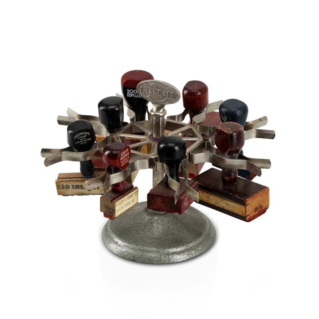 Details: Various stamps on a round metallic stand. Dimensions: 7" H x 9" W x 9" D