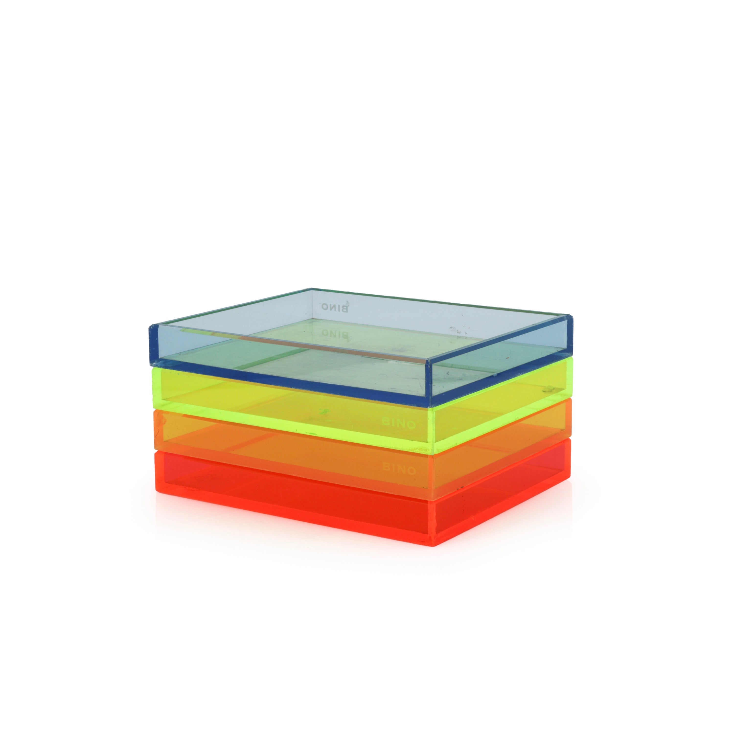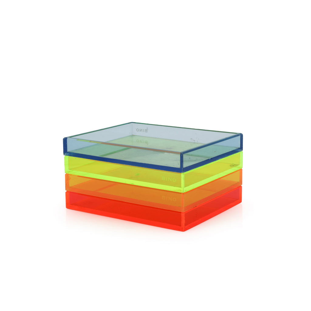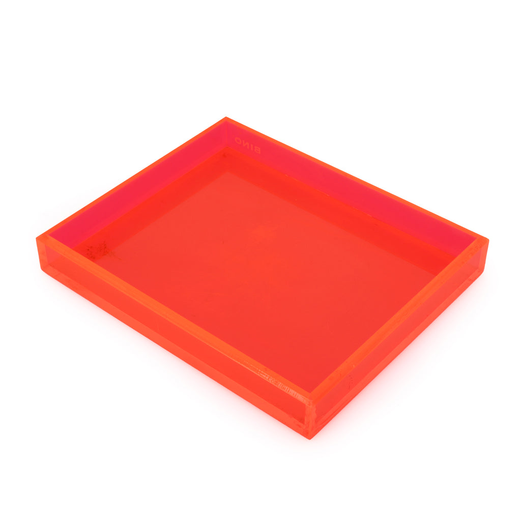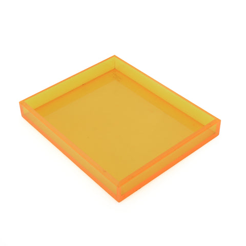 Details: Transparent neon orange paper tray. Part of a set of 4 (other colors rented separately). Dimensions: 1.5" H x 9.5" W x 11.5" D