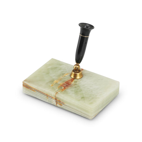 Details: Vintage pen holder with brass hardware, black acrylic tip, and jade base. Dimensions: 4" H x 4.5" W x 3" D