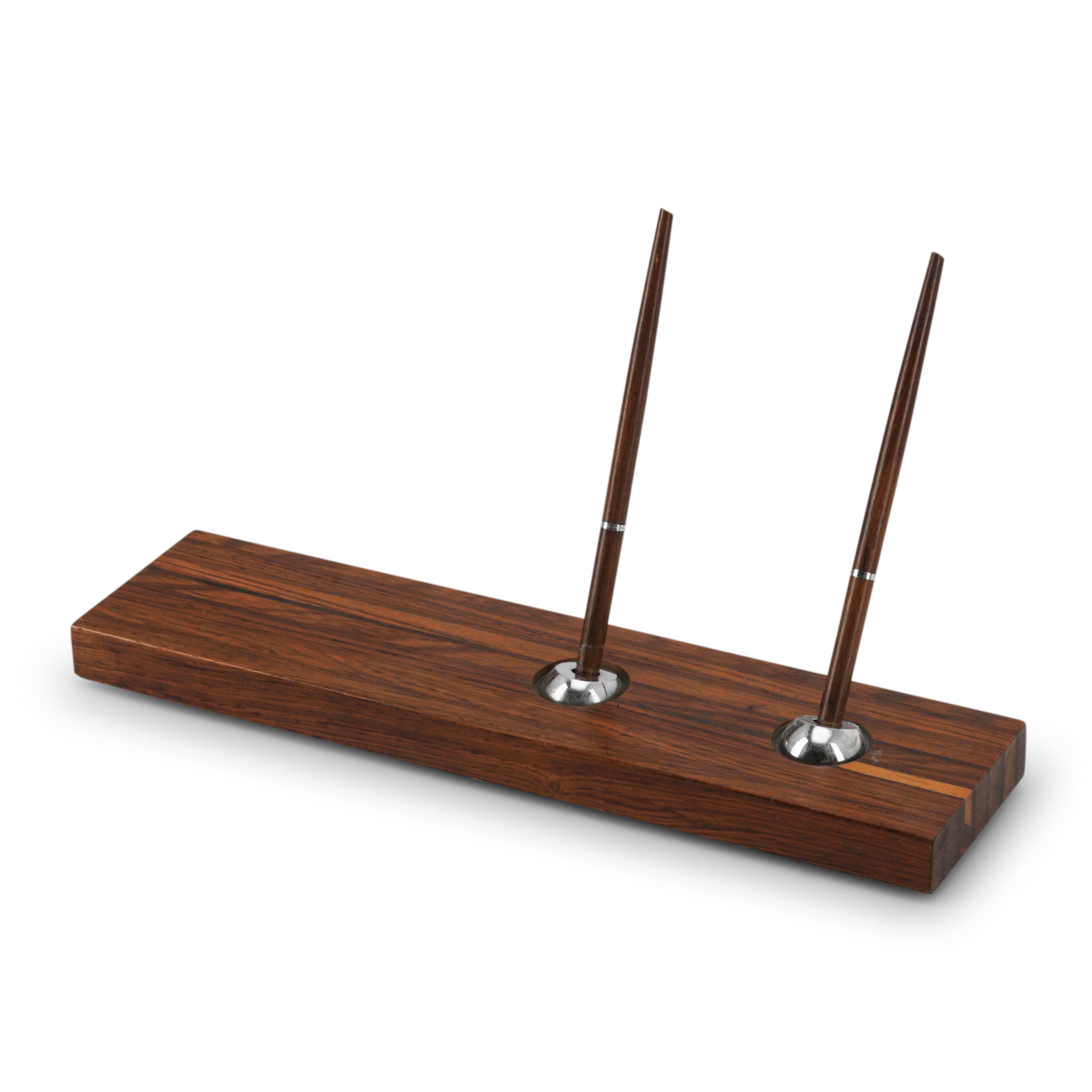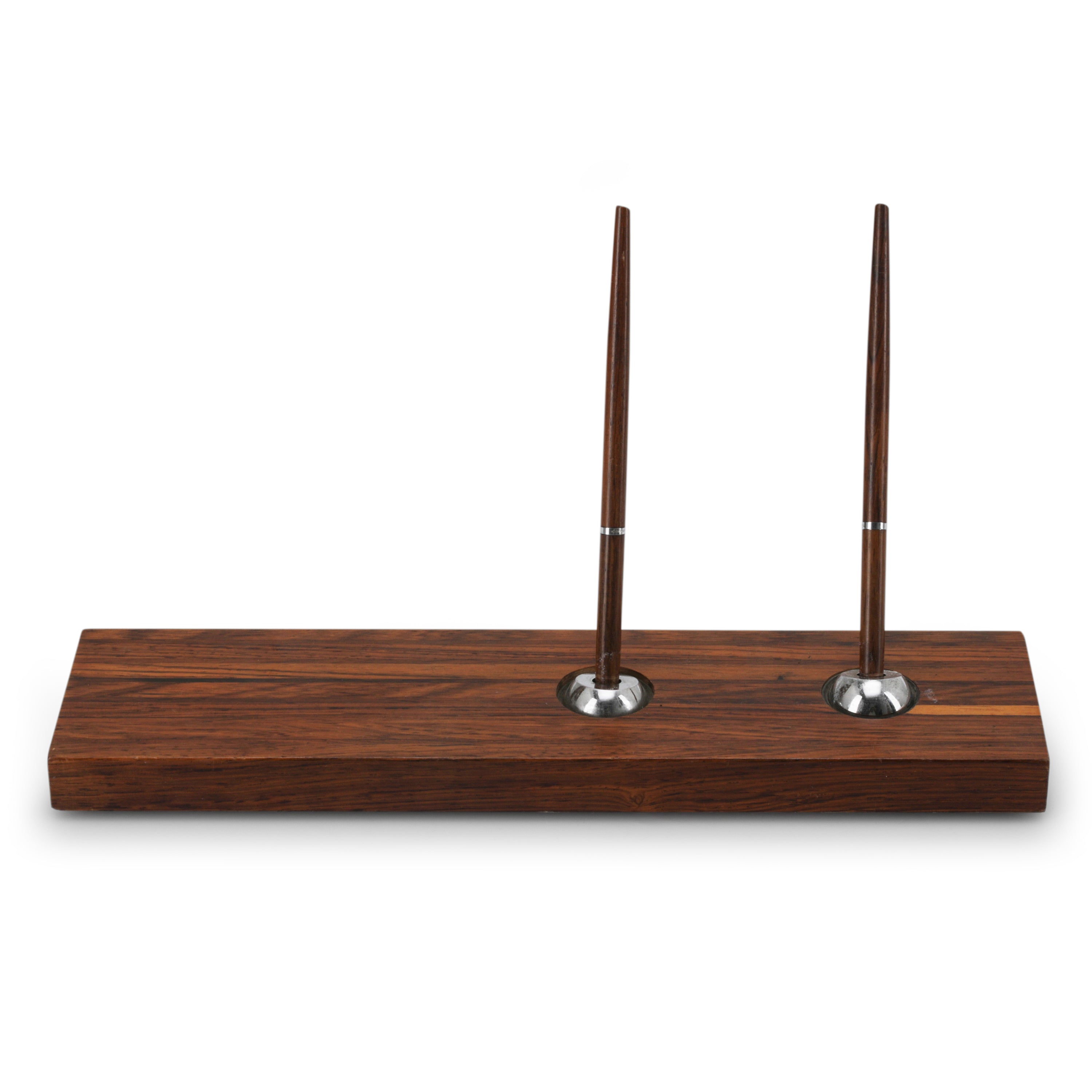 Details: Wooden pen holder with metallic inserts. Dimensions: 2" H x 7" W x 3" D