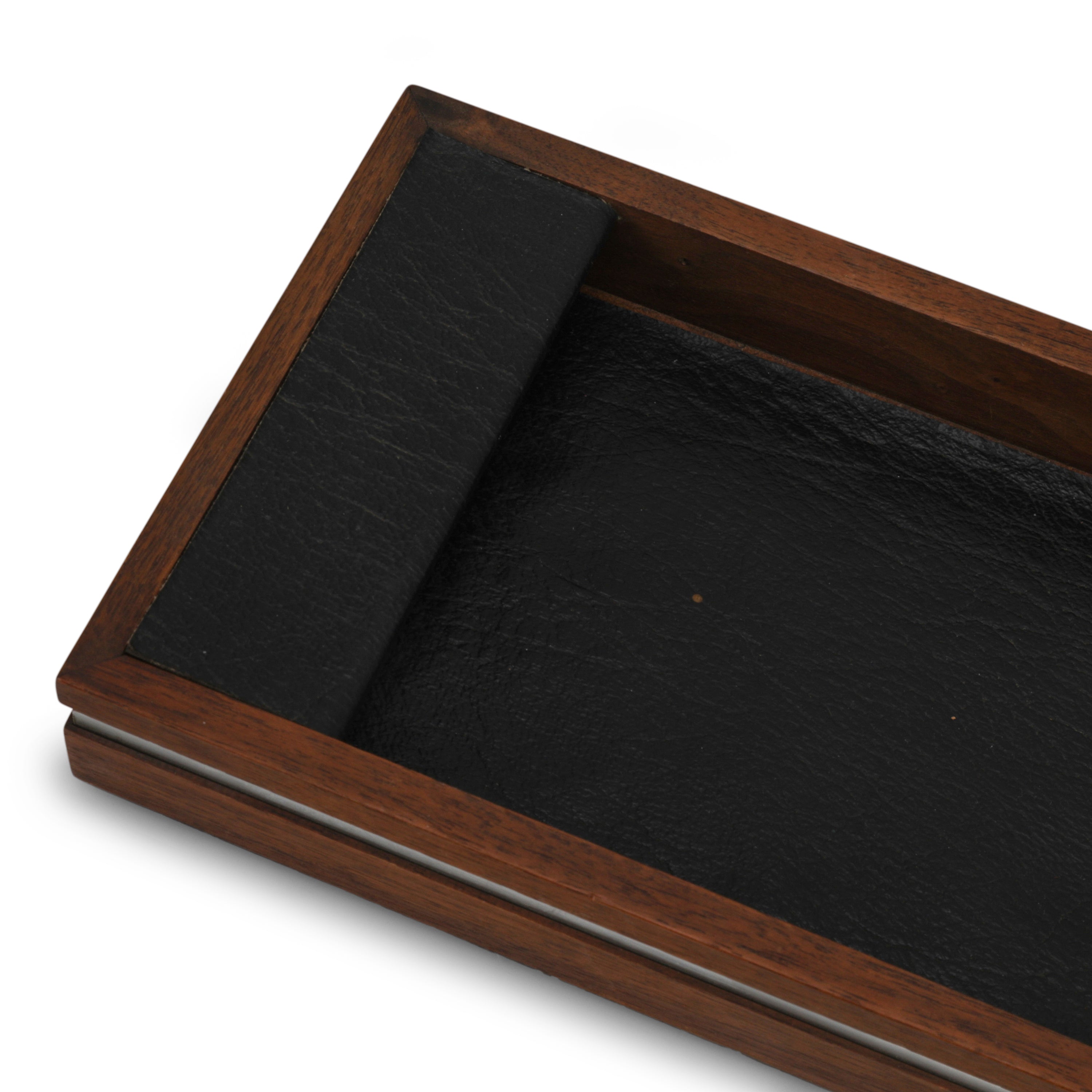 Details: Vintage wood desk accessory with silver inlay and leather tray. Dimensions: 1.75" H x 6" W x 9" D