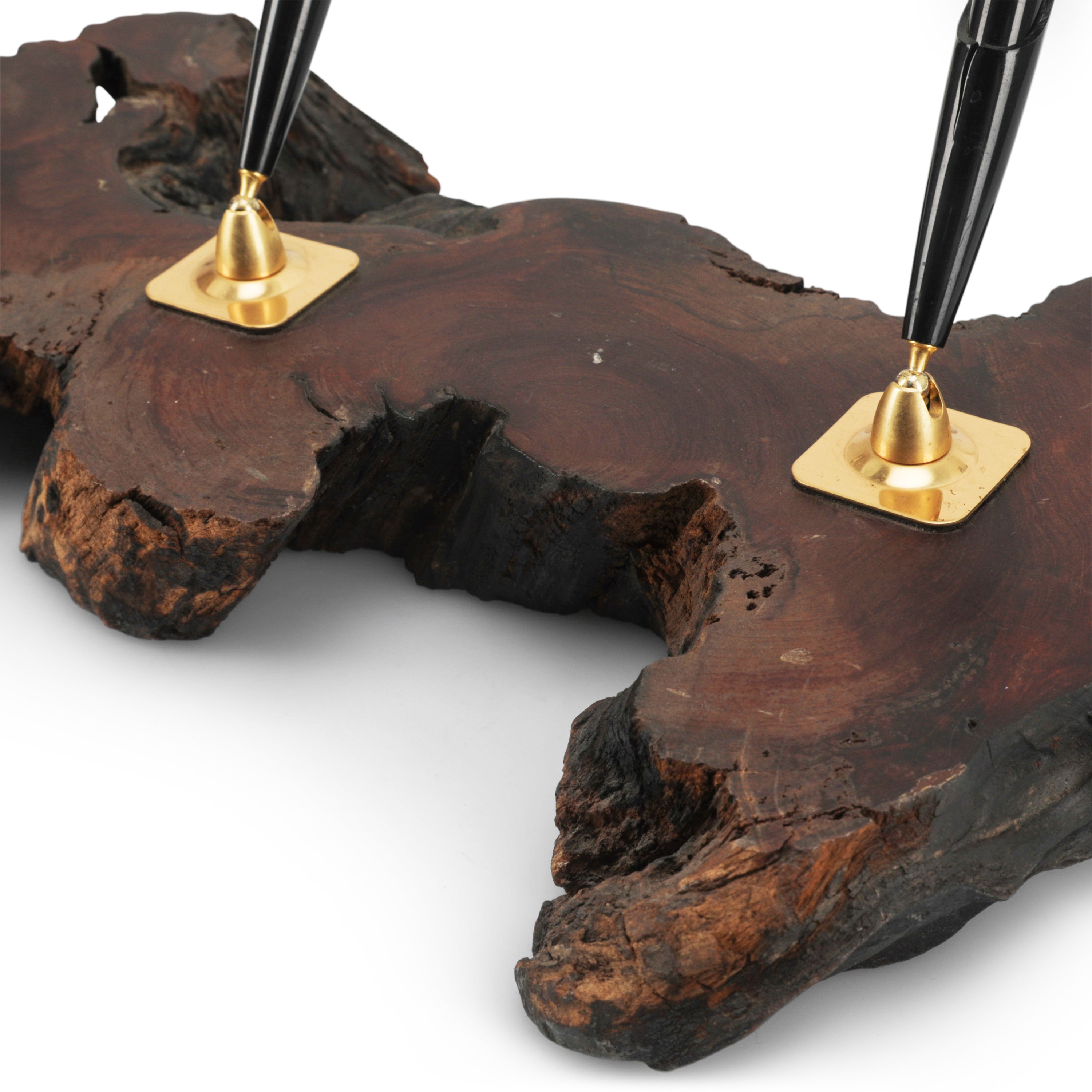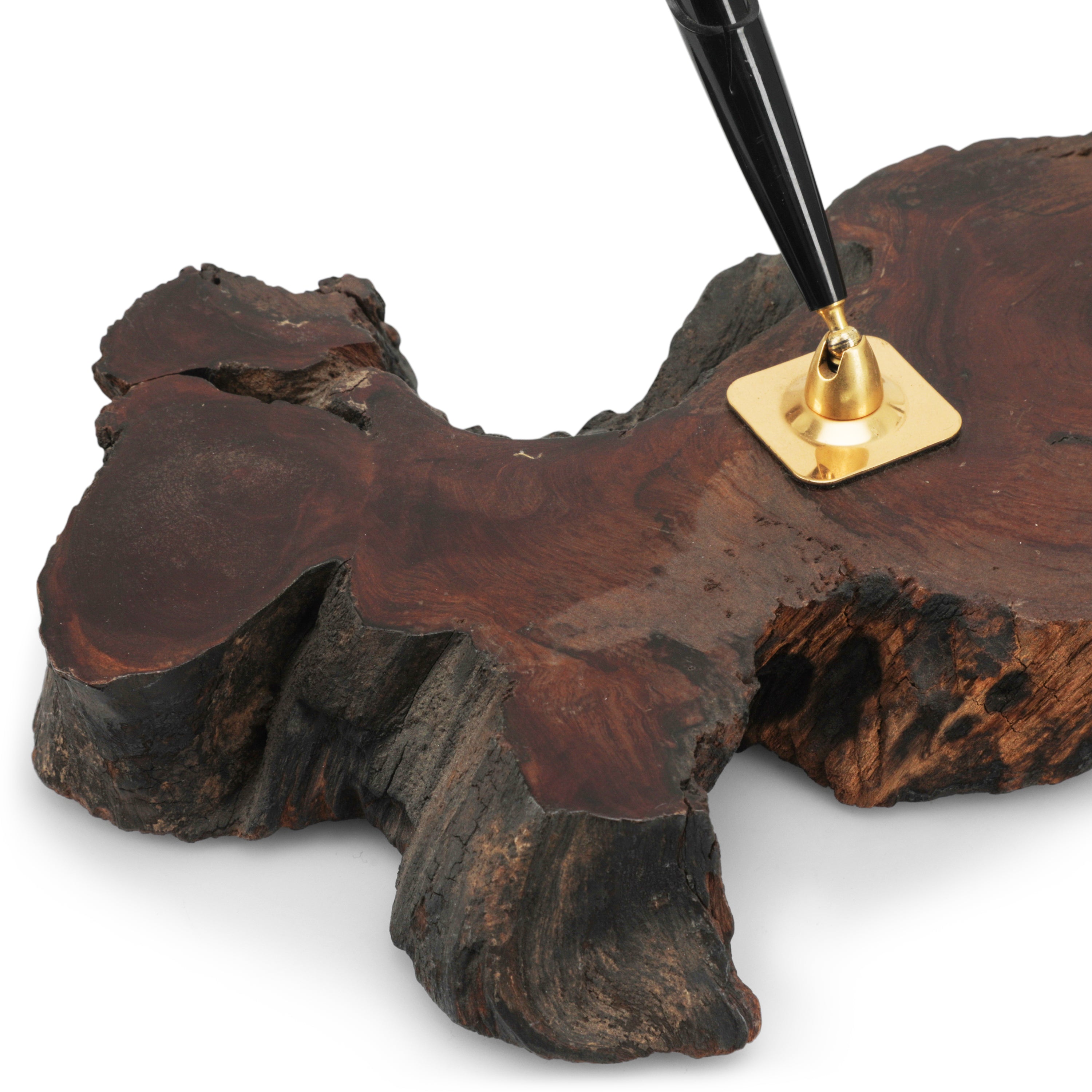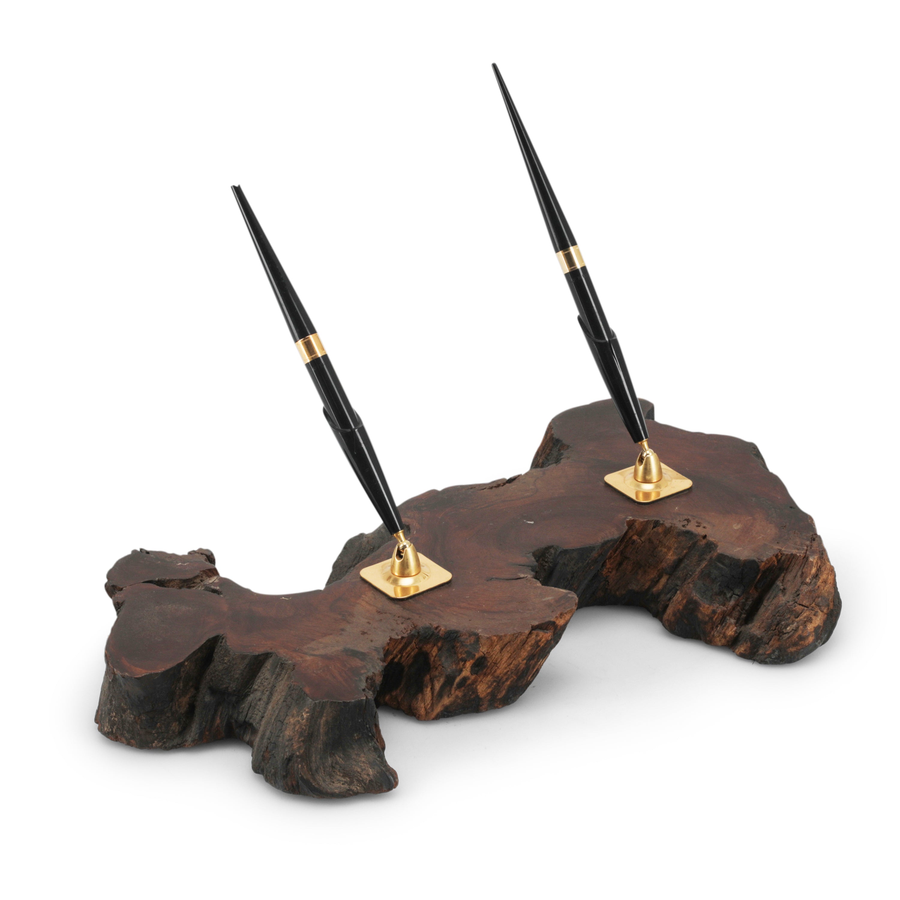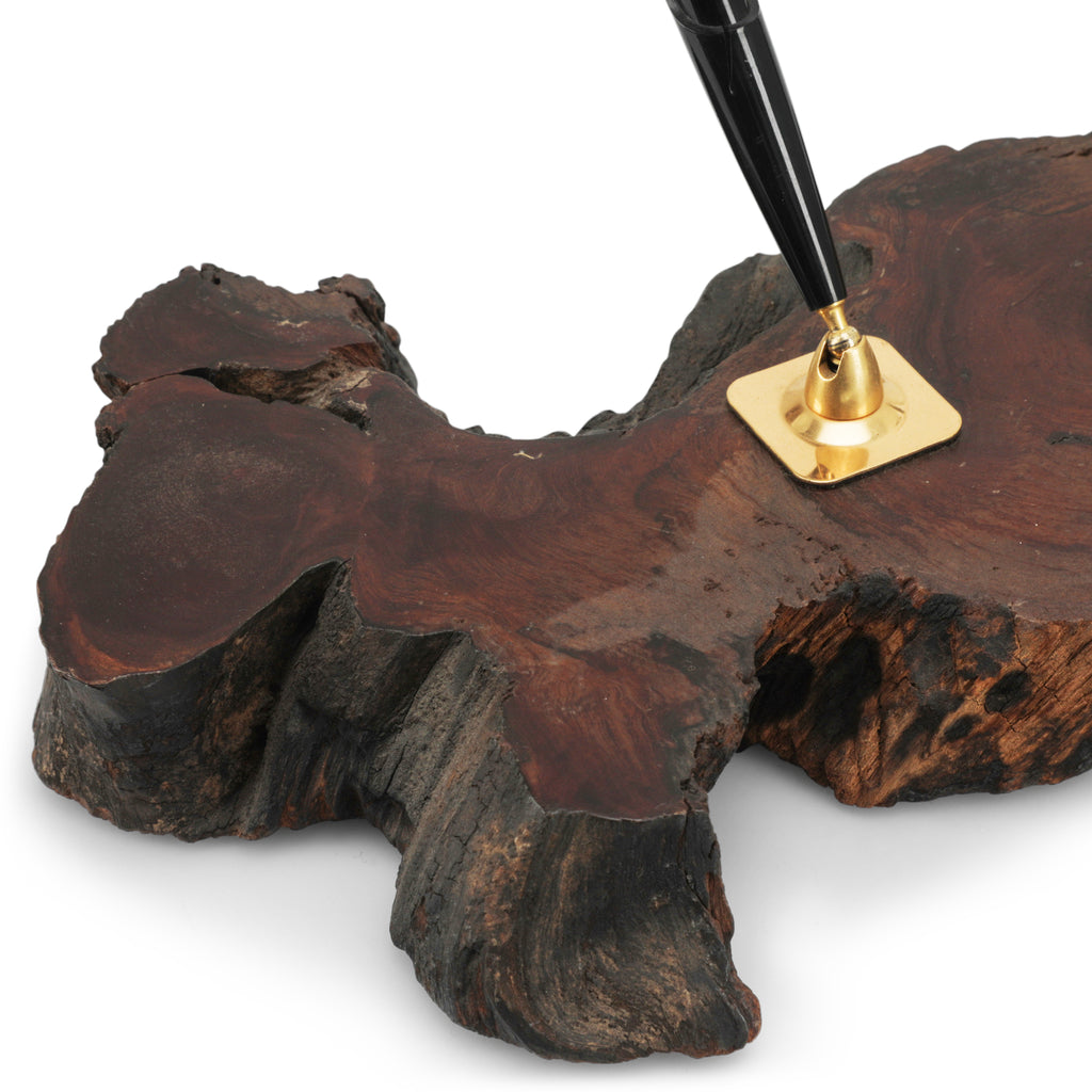 Details: Pen holder carved out of wood with brass hardware. Dimensions: 10" H x 12" W x 8" D