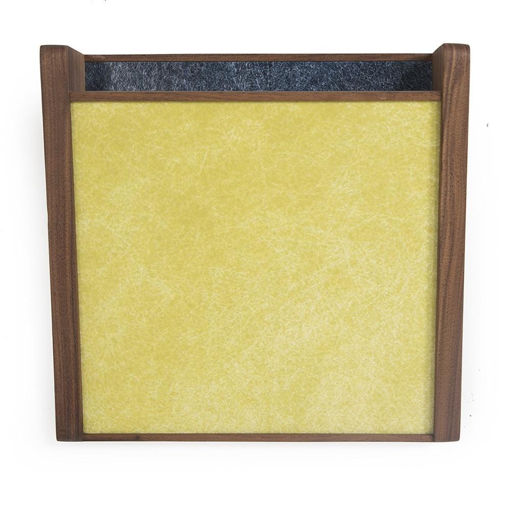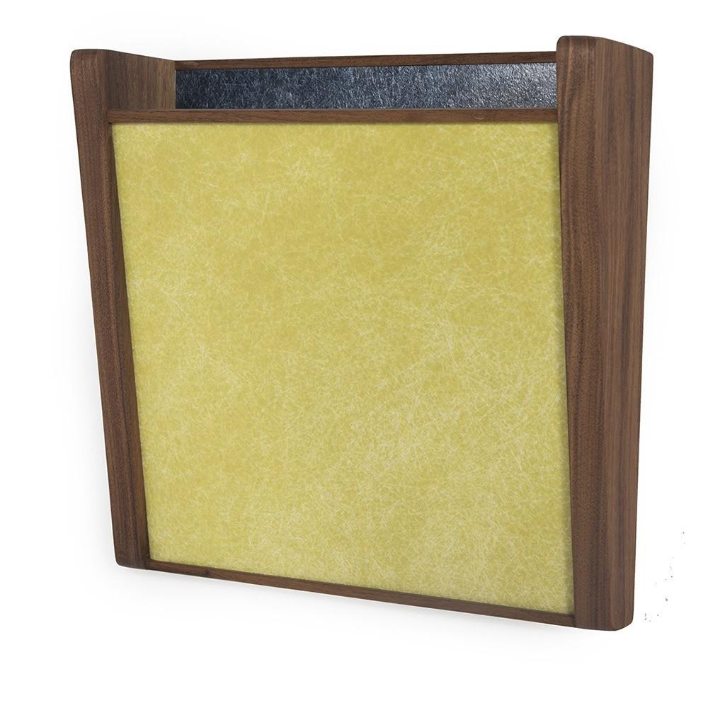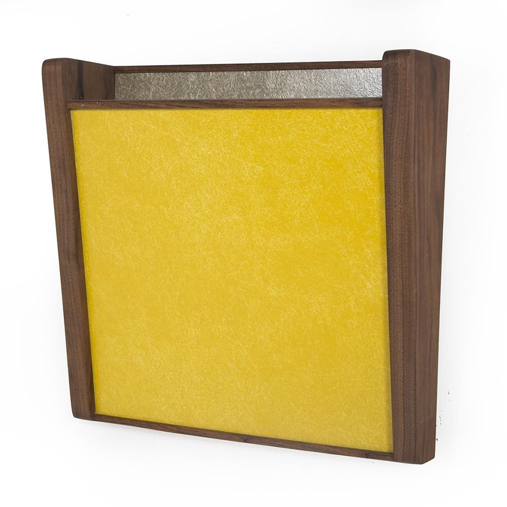 Details: Yellow-gold wall pocket made of fiberglass with dark wooden sides Dimensions: 12.5" H X 11" W X 1.25" D