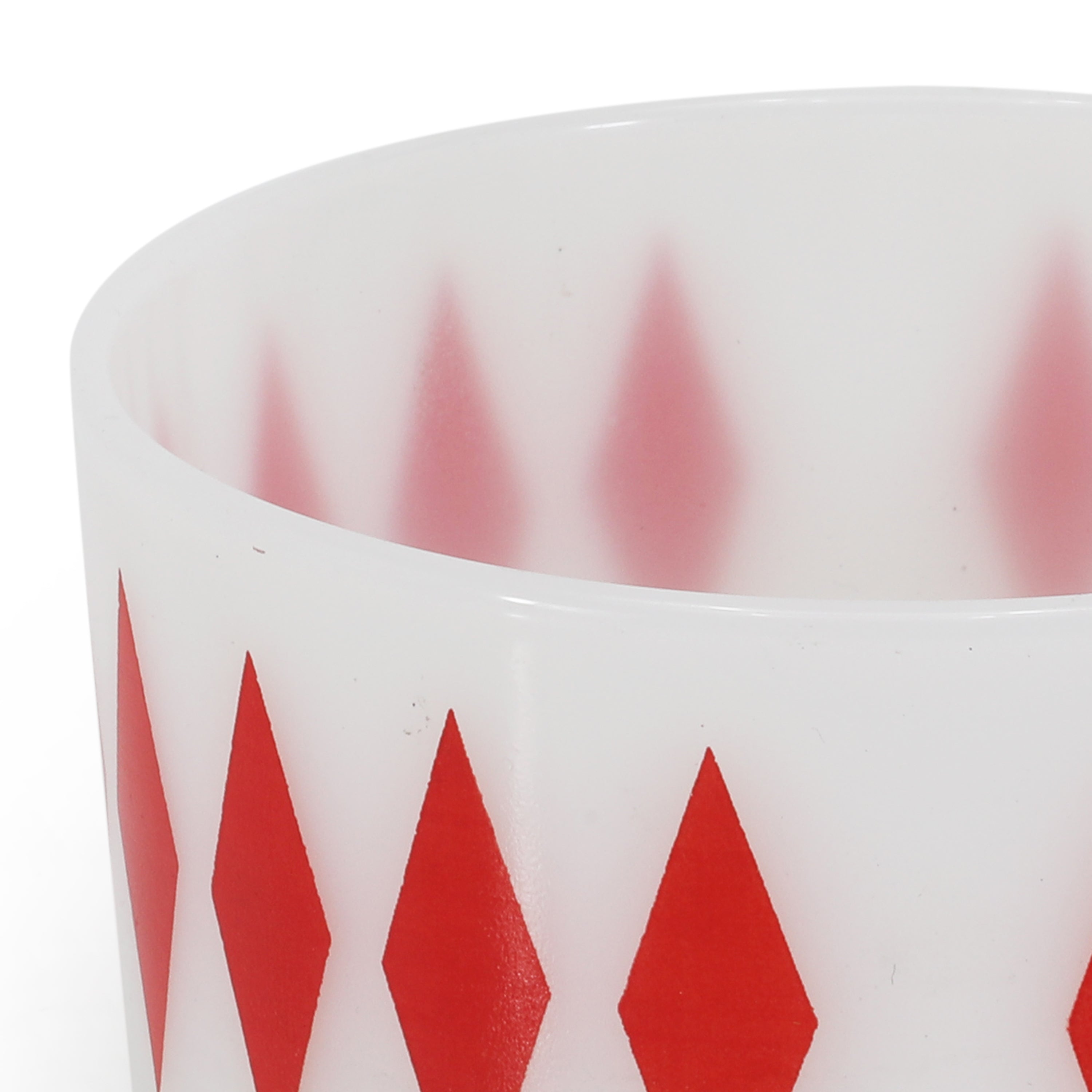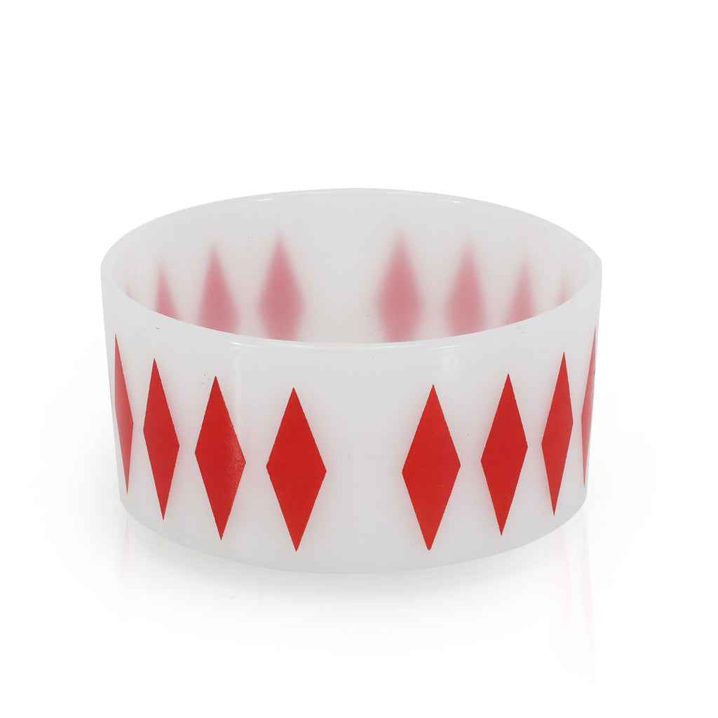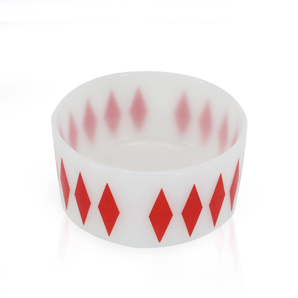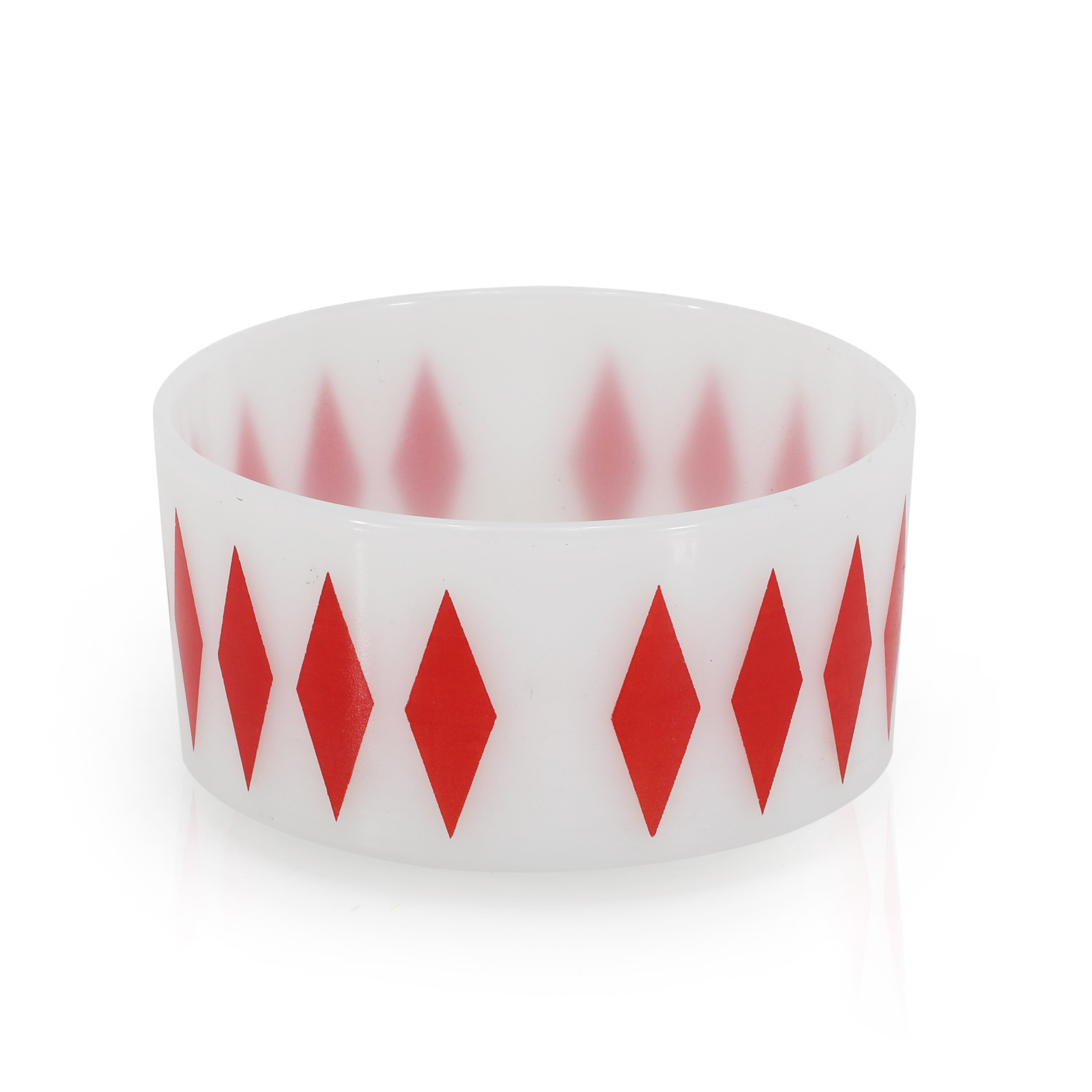 Details: Small white glass dish with red diamonds Dimensions: 2" H x 4" D Quantity: 2