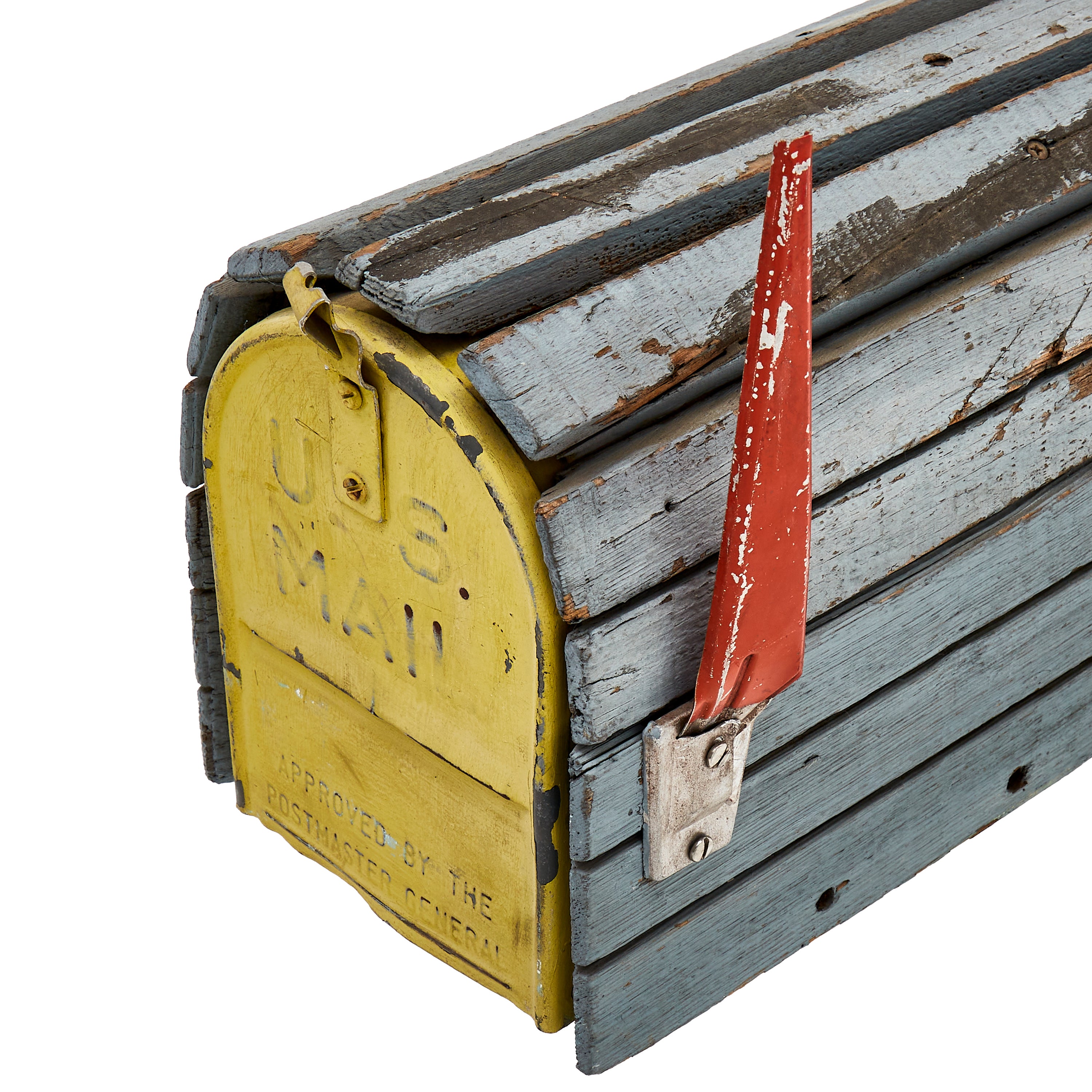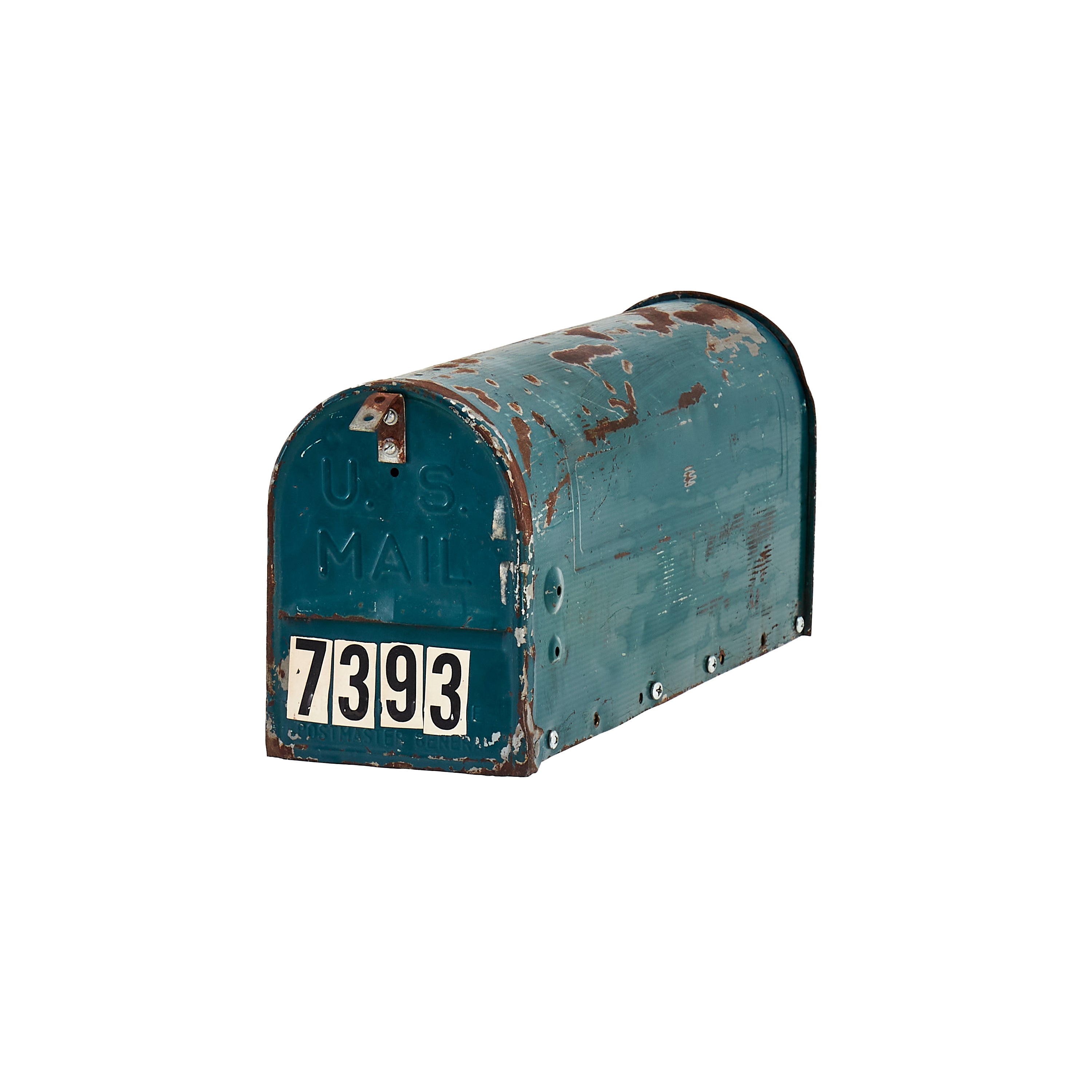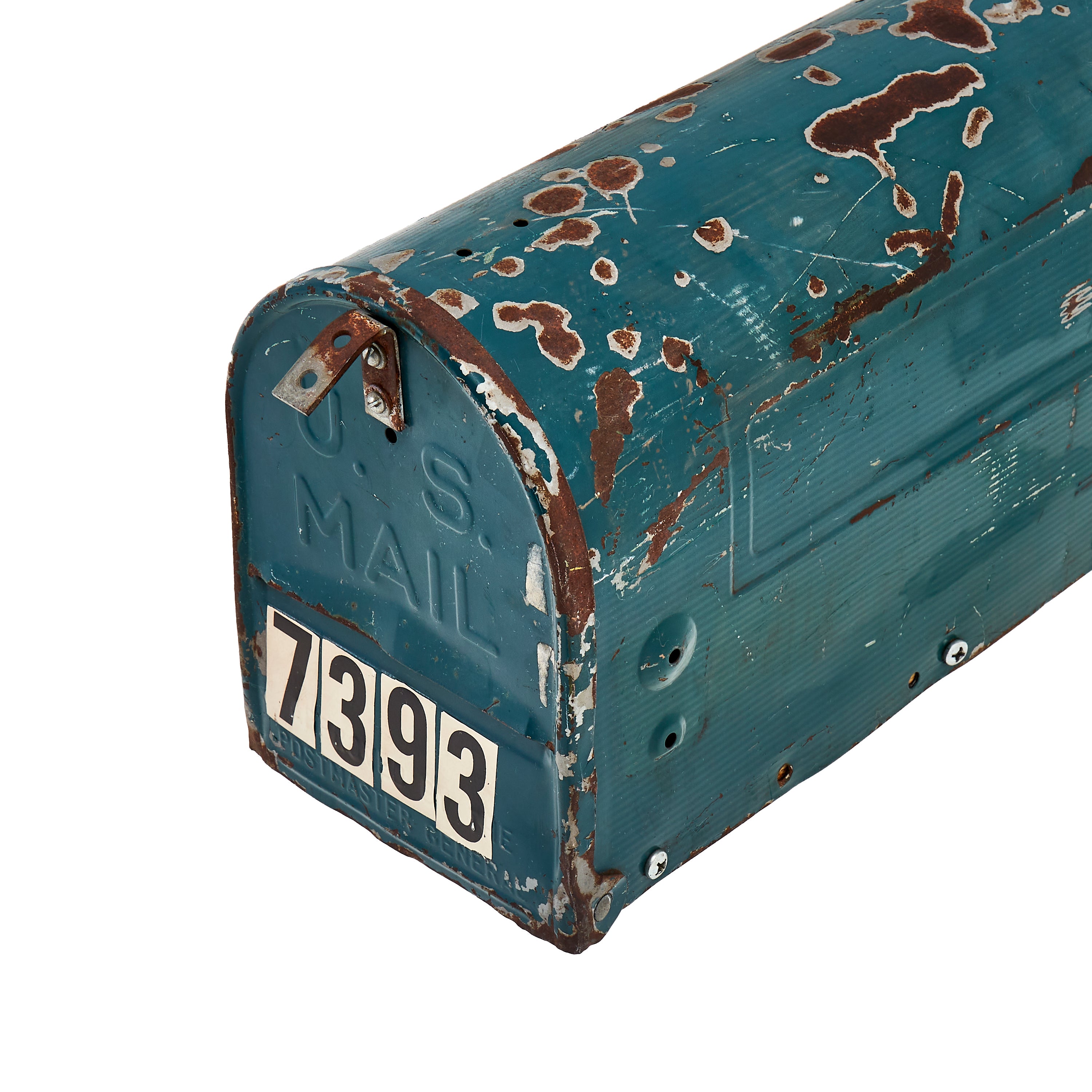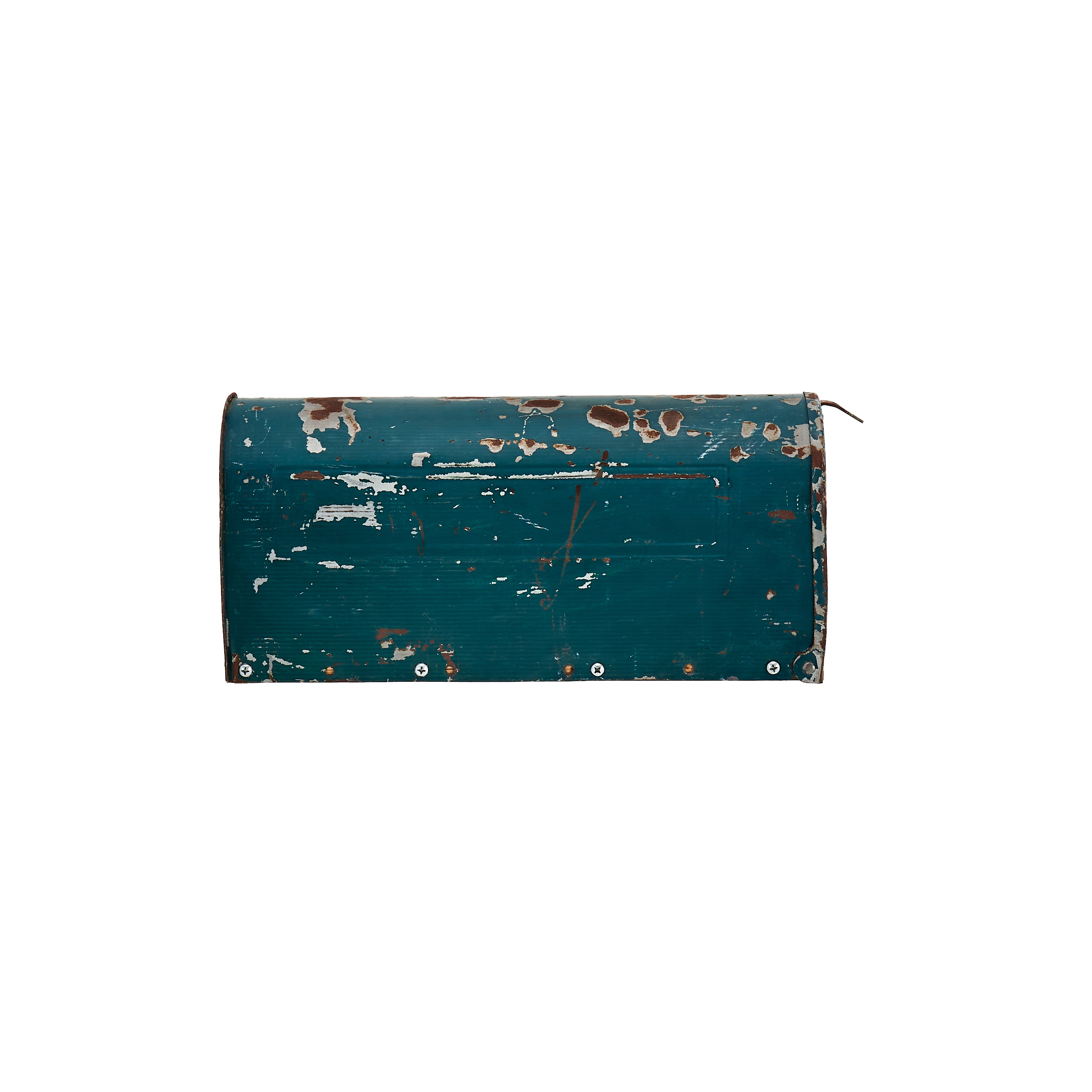 Details: Small blue industrial container made of weathered corrugated metal and with TEX in large white letters down the side Dimensions: 16.5" H x 31"...