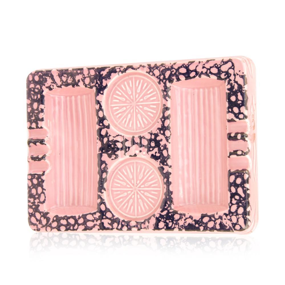 Details: Ashtray with cigarette holders, citrus fruit patters made from pink and black ceramic. Dimensions: 1.75" H x 12" W x 8" D