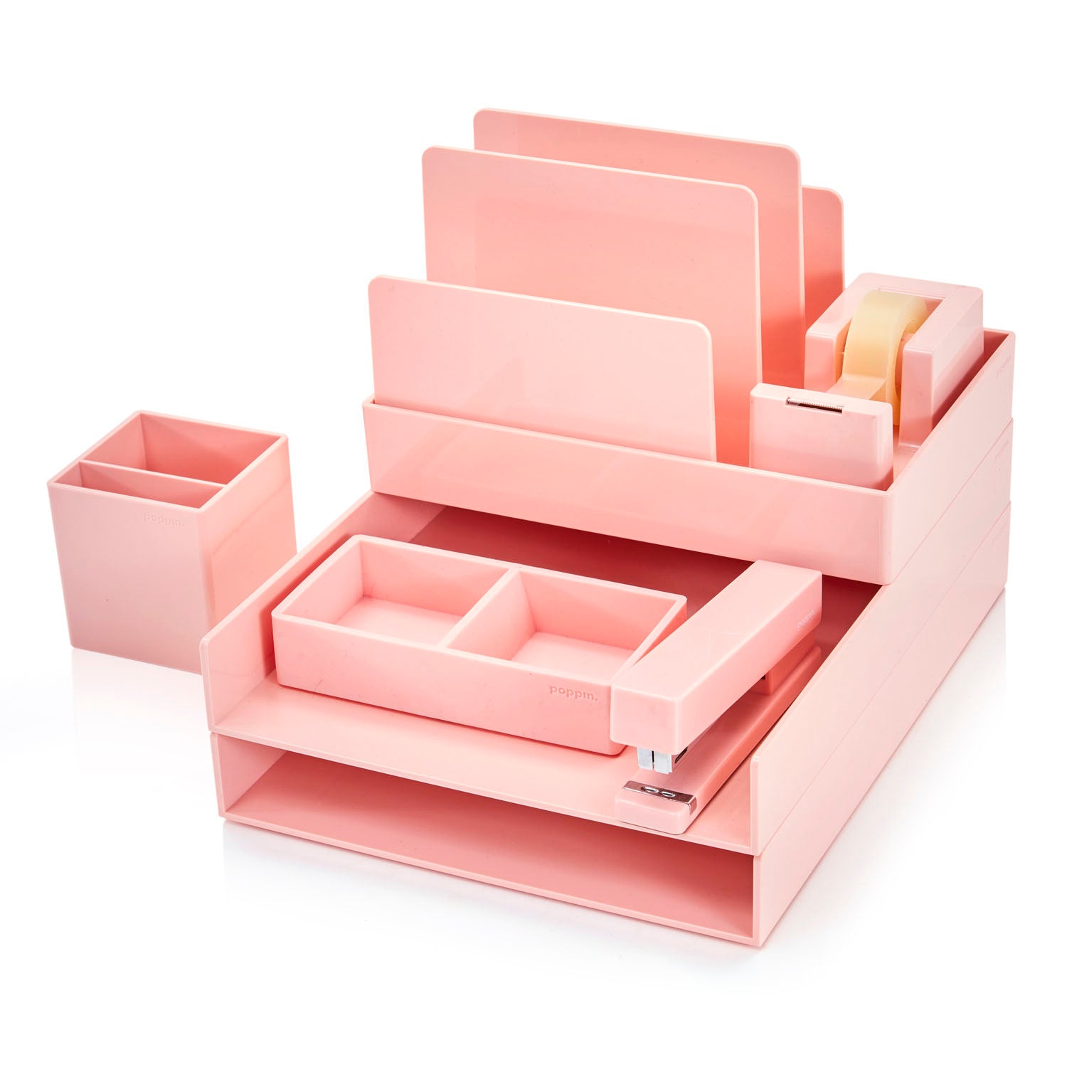 Details: Pink plastic desk tray from matching set Dimensions: 1.75" H x 9.75" W x 6.75" D