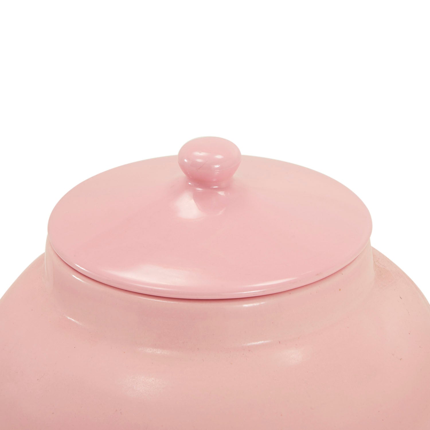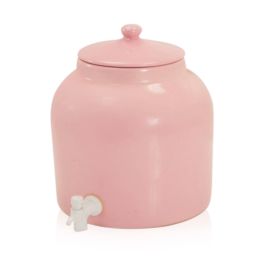 Details: Pink ceramic water cooler with lid and spigot Dimensions: 12" H x 11" W x 11" D