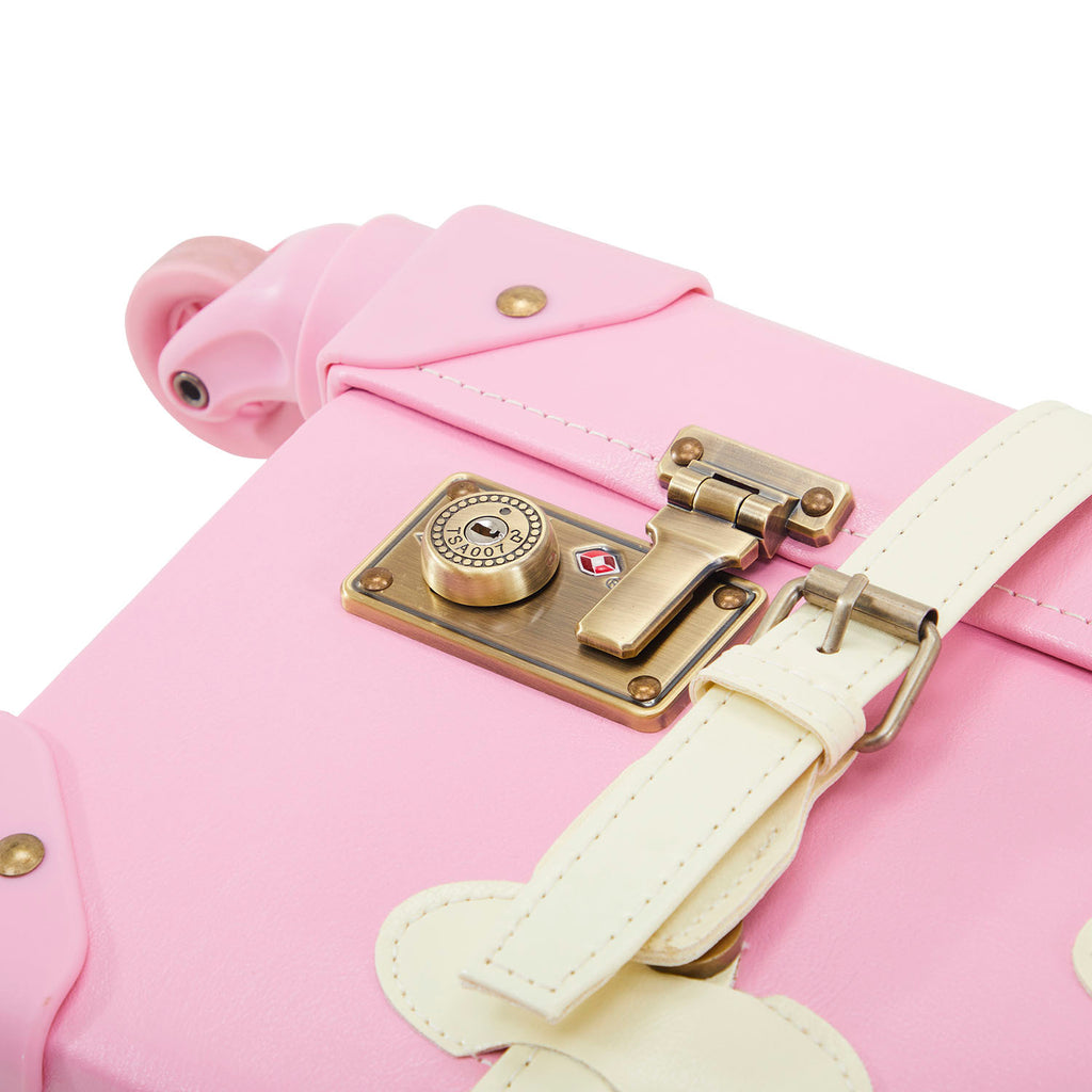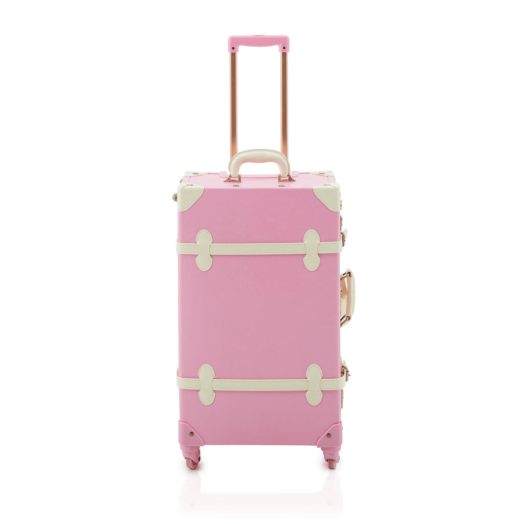 Details: Large pink leather roller suitcase with white straps and striped interior Dimensions: 26" H x 15" W x 9" D Quantity: 1