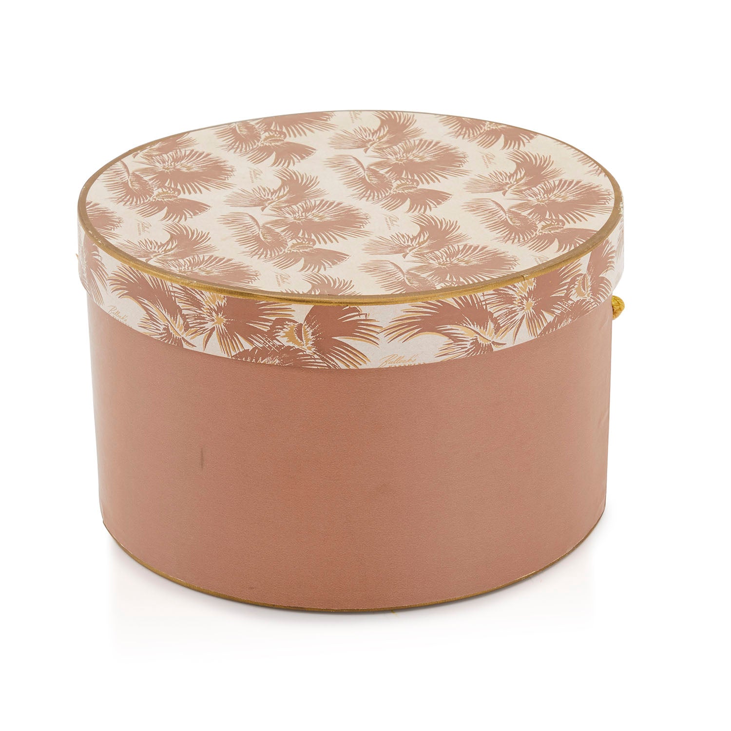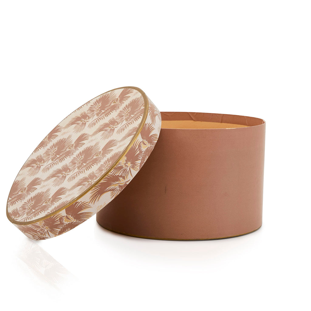 Details: Round brown hat box with palm tree design on white lid and gold detail Dimensions: 6" H x 10" W x 10" D