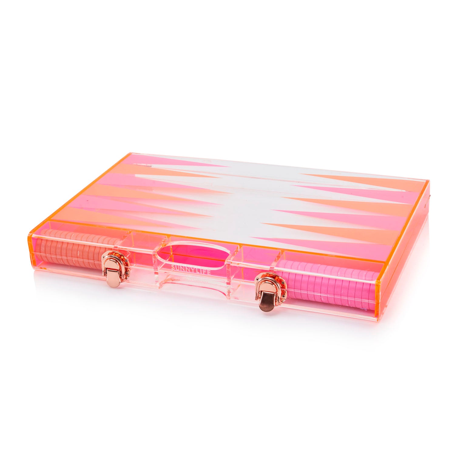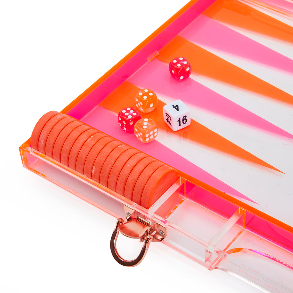 Details: Clear- pink- orange plexi backgammon set with chips and dice Dimensions: 1" H x 21" W x 16.5" D Quantity: 1