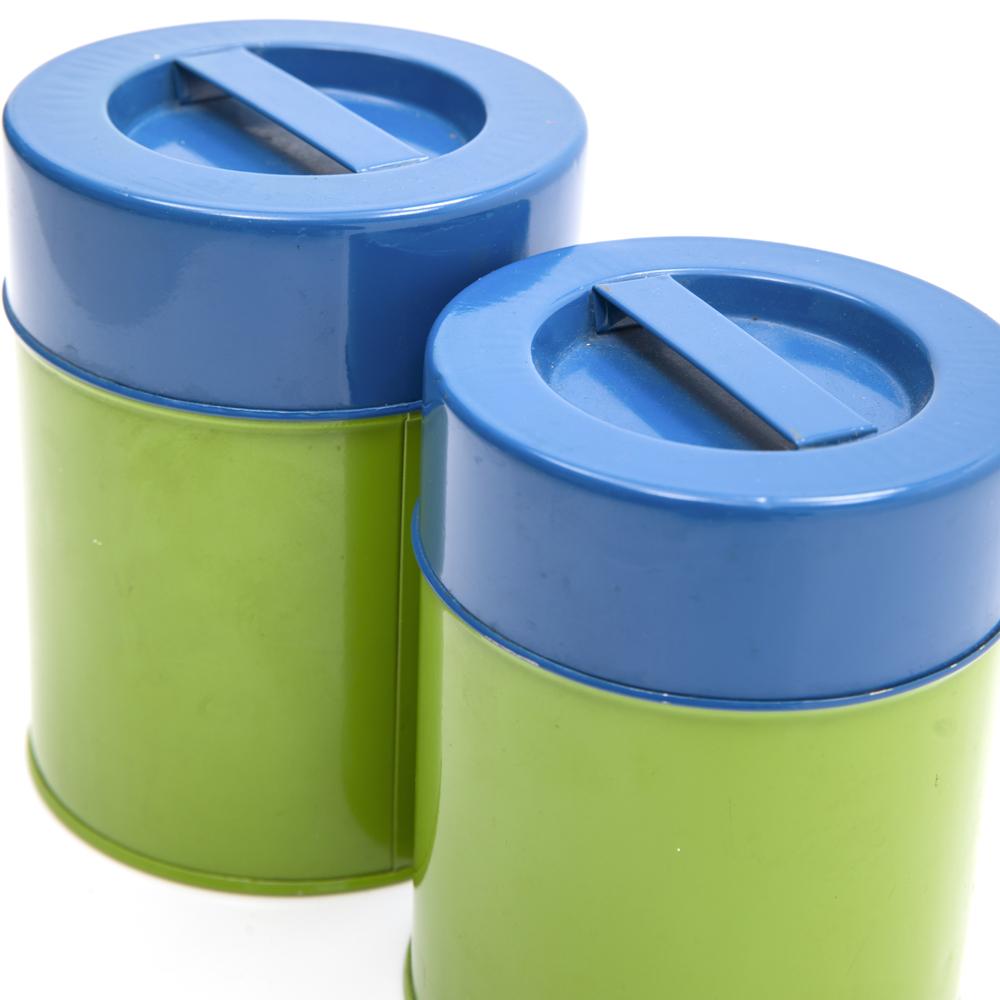 Details: Green plastic vintage canisters with blue lids.