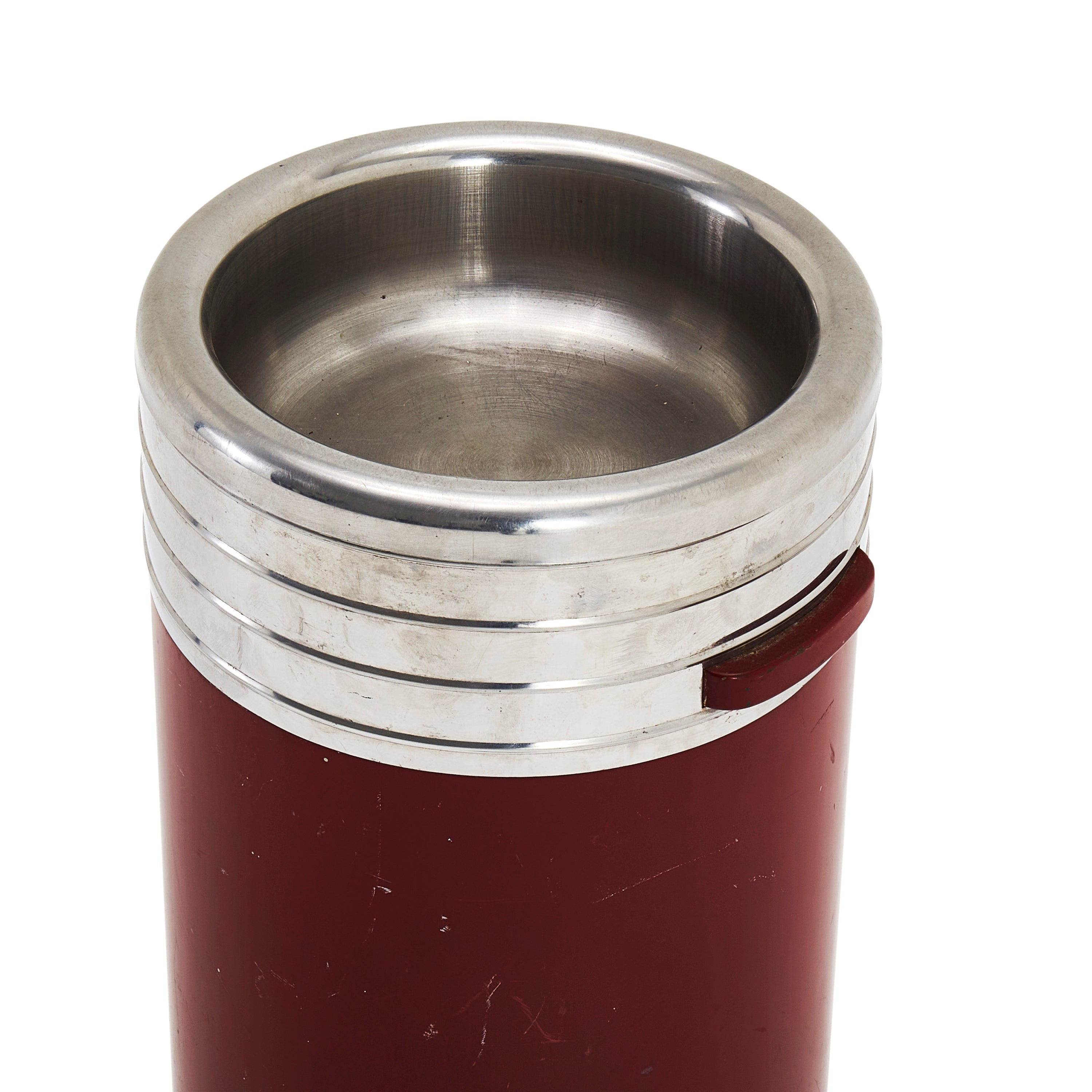 Details: Red cylinder standing ashtray with silver ends. Dimensions: 21" H x 11" W/L