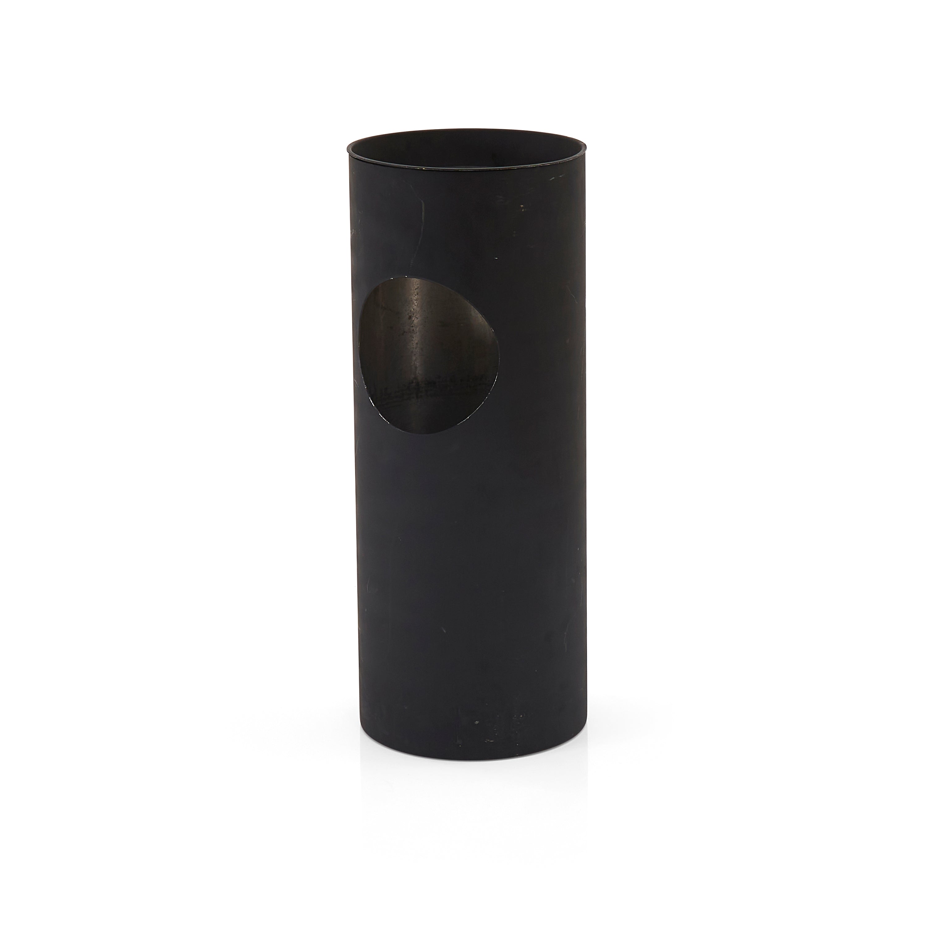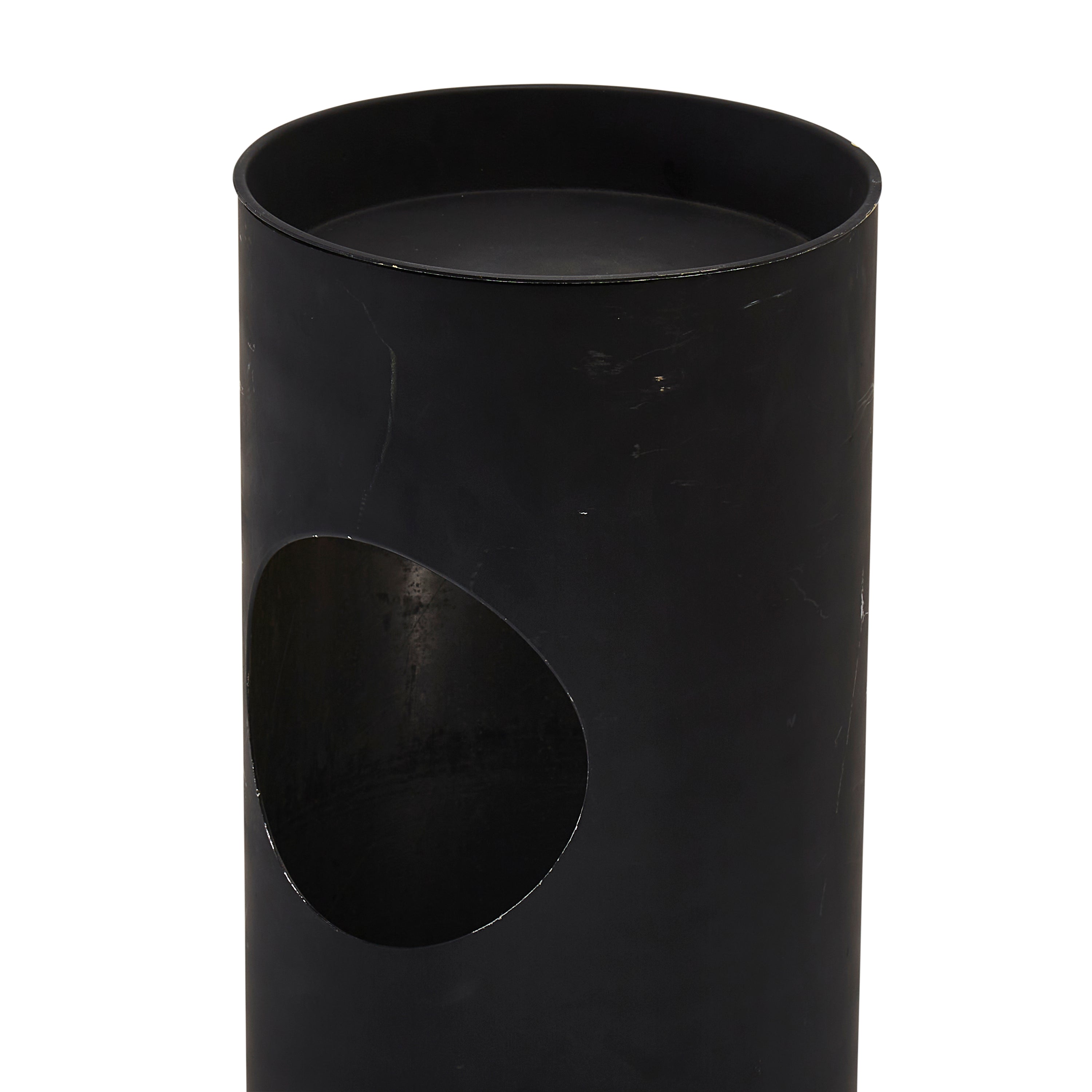 Details: Black cylinder standing ashtray with circular opening on side. Dimensions: 26" H x 10" W/L