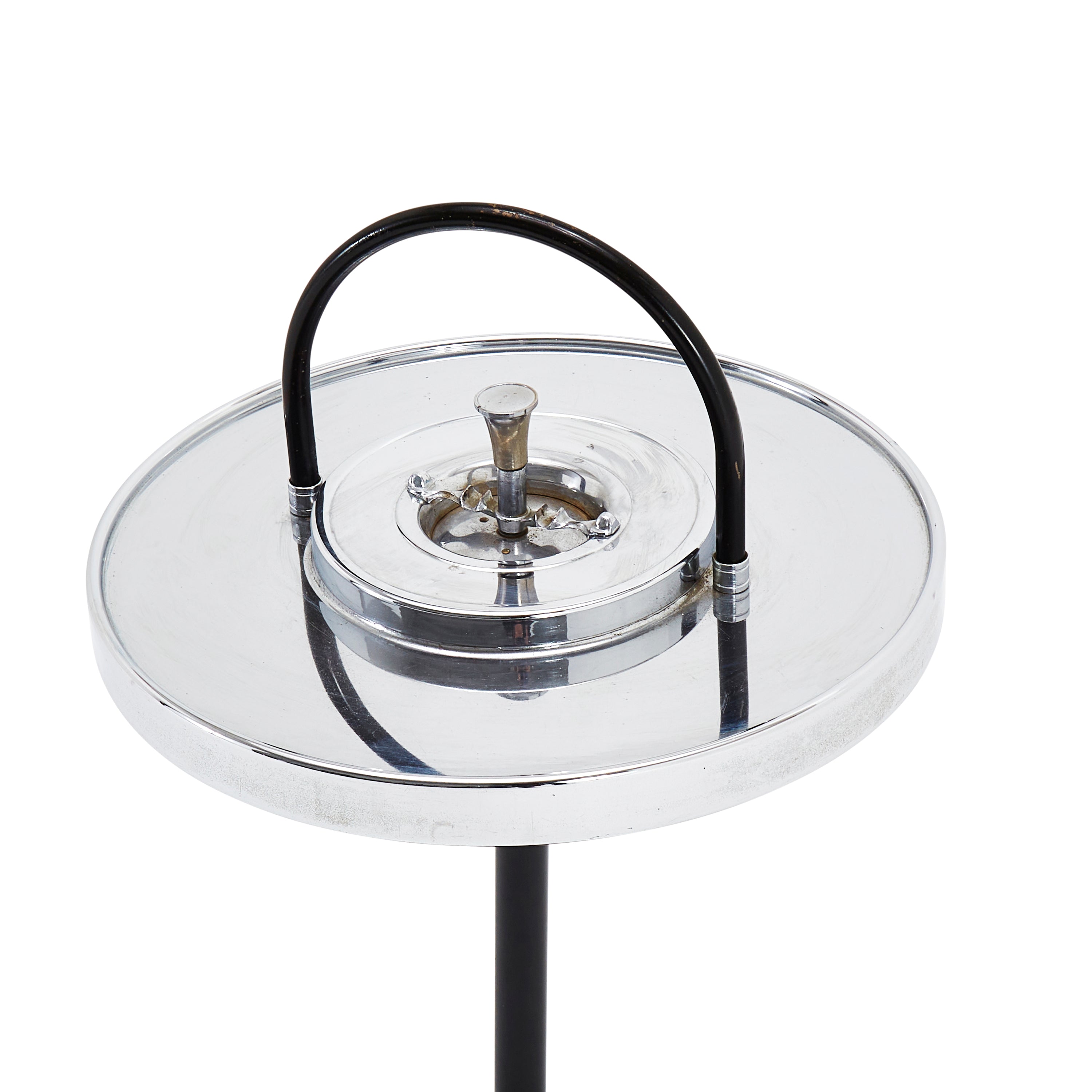 Details: Standing black ashtray with silver saucer and black handle. Dimensions: 28" H x 15" W/L