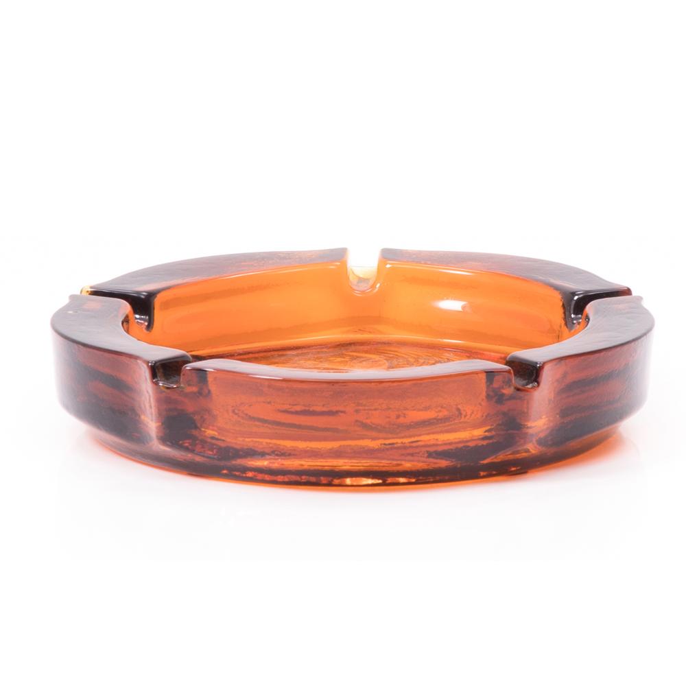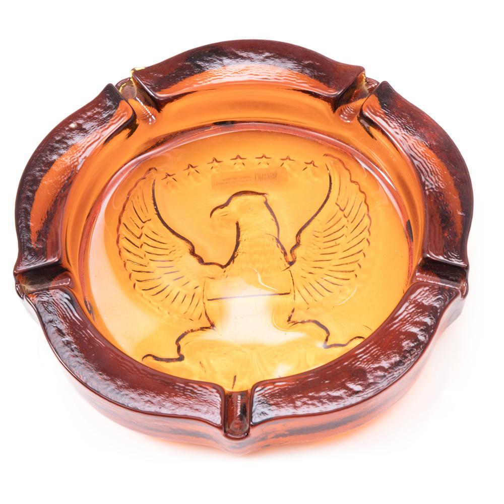 Details: Amber Ashtray, Bald Eagle Base Etching Dimensions: 2" H x 10" W x 10" D