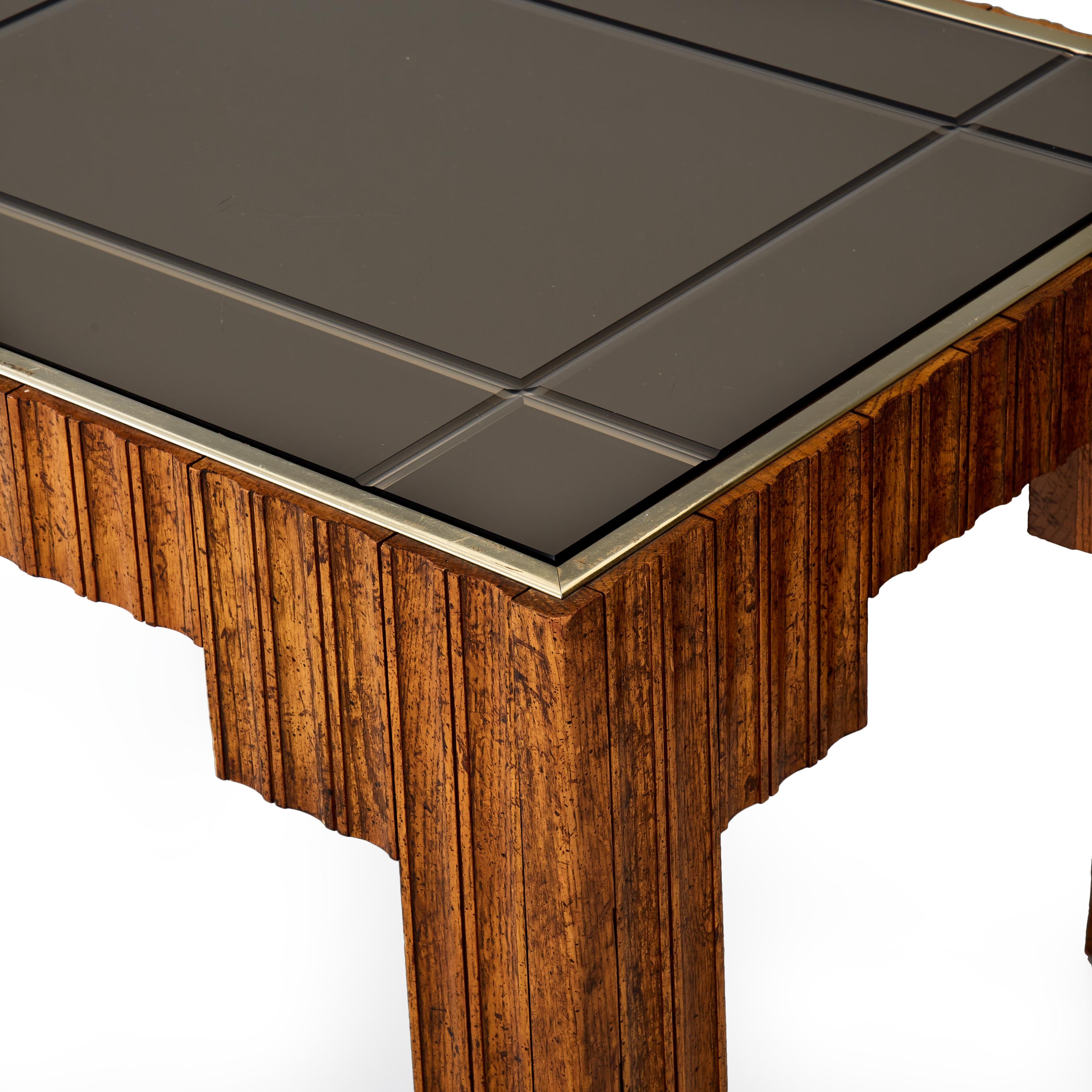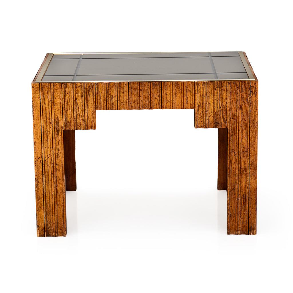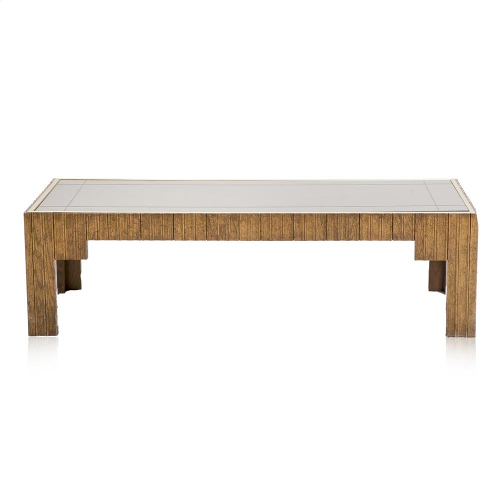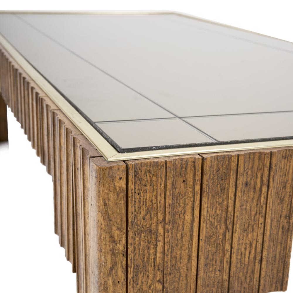 Details: Wide wood and brass vintage dresser with brass accented base, six drawers, and multi-stained wood paneling Dimensions: 28.5" H x 54.5" W x 19" D...