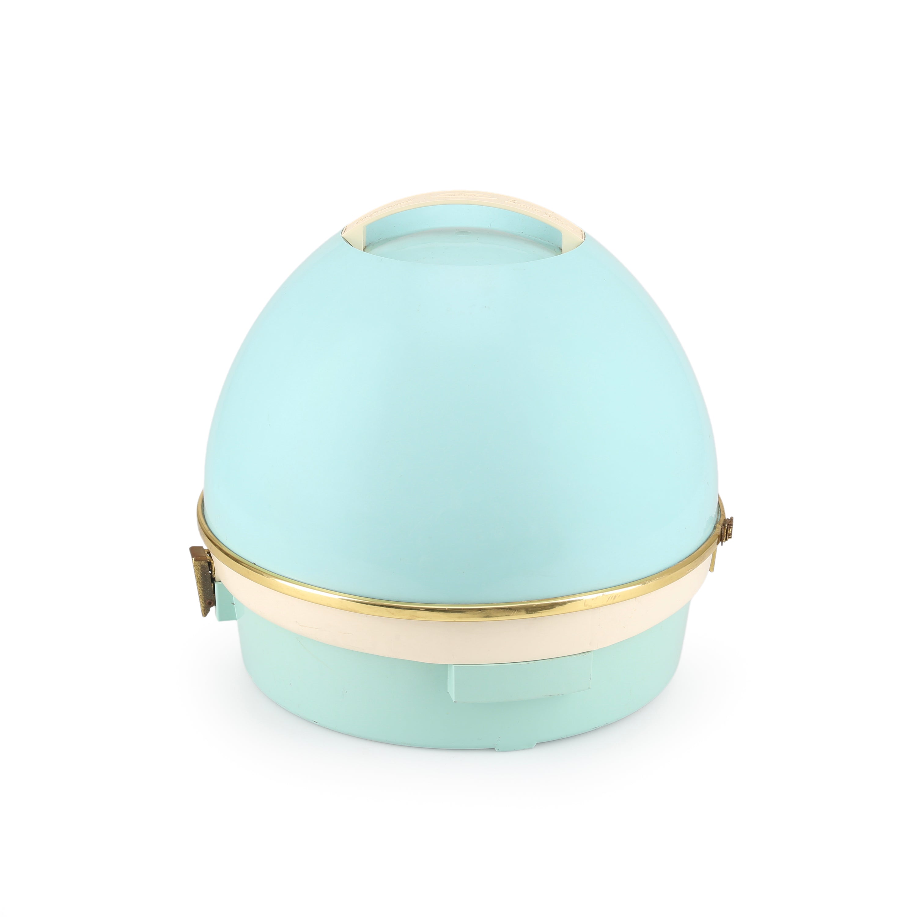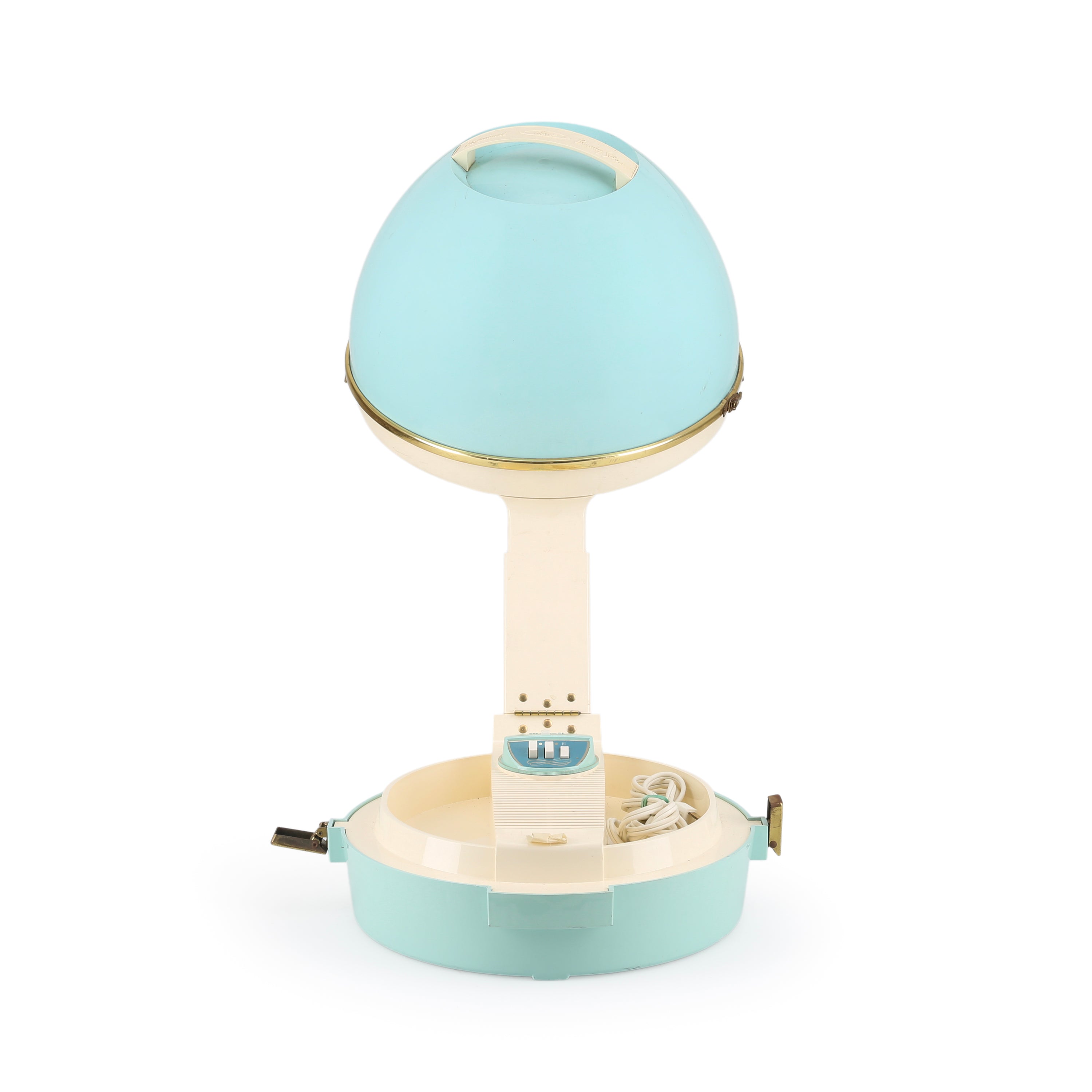 Details: Light blue / cream hair dryer with brass trim. Dimensions: 19" H x 12" D (open) 12" H (closed)