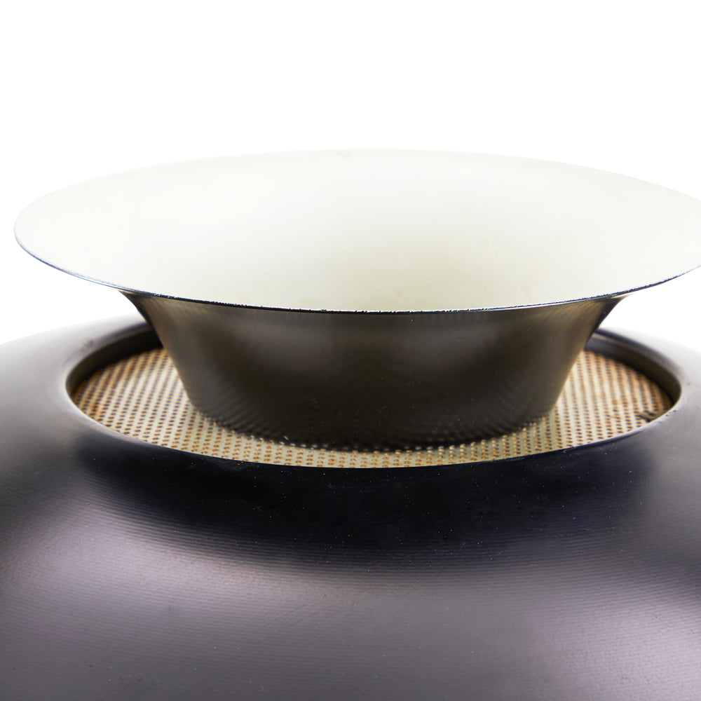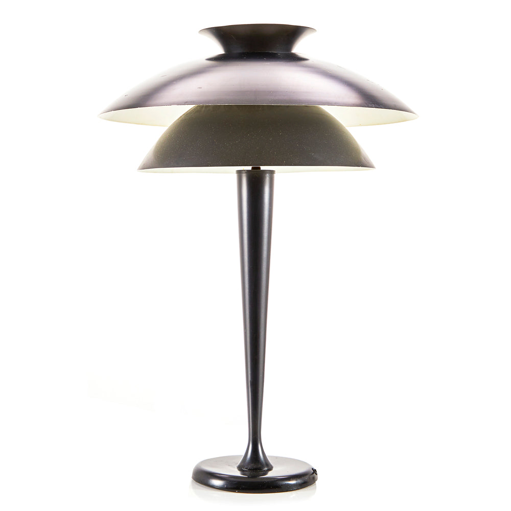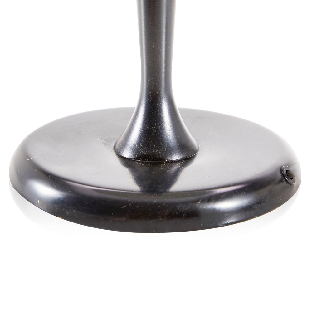 Details: Black oval cutout frame mid-century floor lamp with long cream fabric shade on metal pole and round base NOTICEABLE WEAR (RENTED AS IS) Dimensions: 59"...