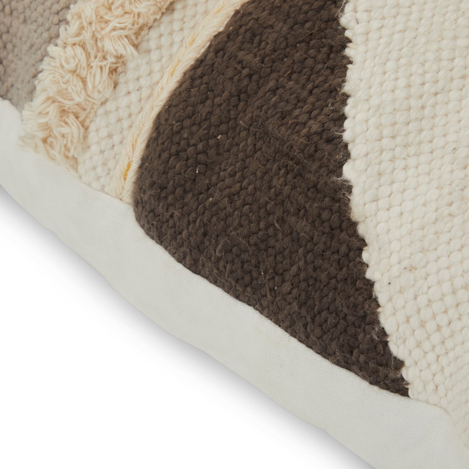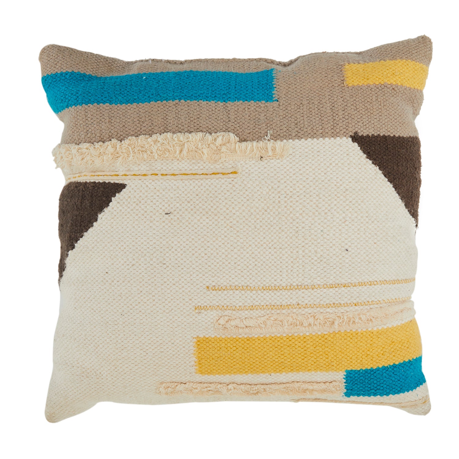 Details: White abstract textile pillow with blue, yellow, black and tan patches Dimensions: 16" H x 15" W x 5.5" D Quantity: 1