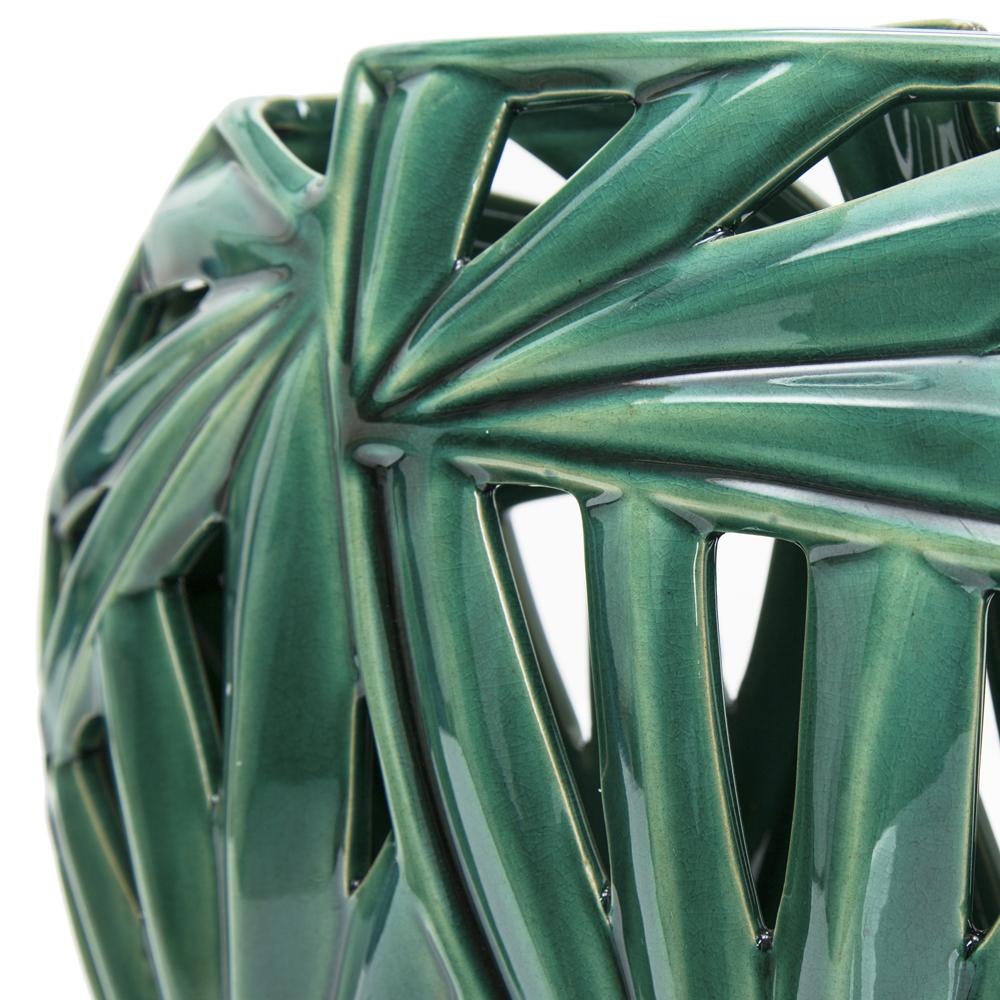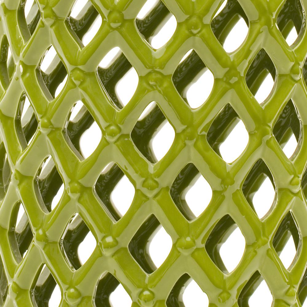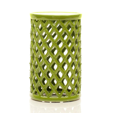 Details: Green ceramic side table with criss crossed bamboo style sides Dimensions: 19" H x 11.5" W x 11.5" D