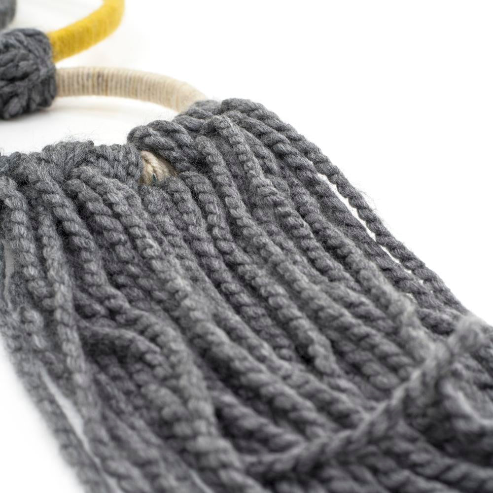 Details: Grey, yellow, and cream macrame with beaded hanging. Dimensions: 38" H x 8" W x 0.25" D Quantity: 1