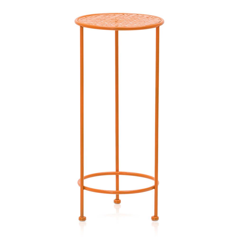 Details: Orange stackable metal side table with cut-out pattern table top, part of a set Dimensions: 22" H x 10" W x 10" D