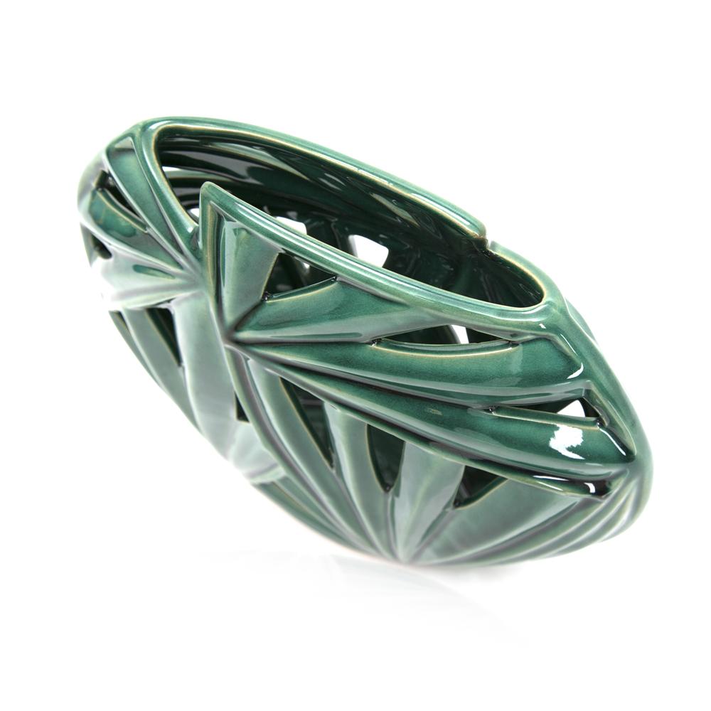 Details: Green vase with glossy finish and leafy design Dimensions: 9.5" H x 11.5" W x 2.5" D
