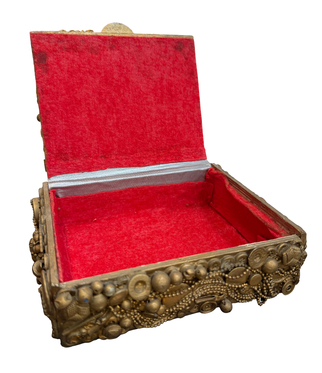 Details: Gold tin box with olive renaissance-era inlay of a female figure and diamond wreath Dimensions: 3" H x 8" W x 5.5" D