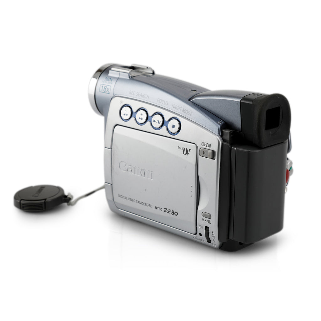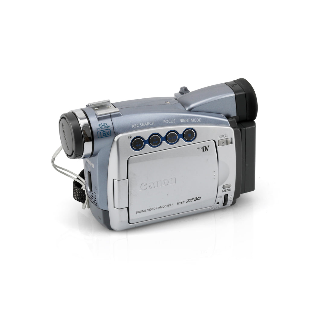 Details: Small portable camcorder with silver / blue exterior. Dimensions: 4" H x 6" L x 1.75" W