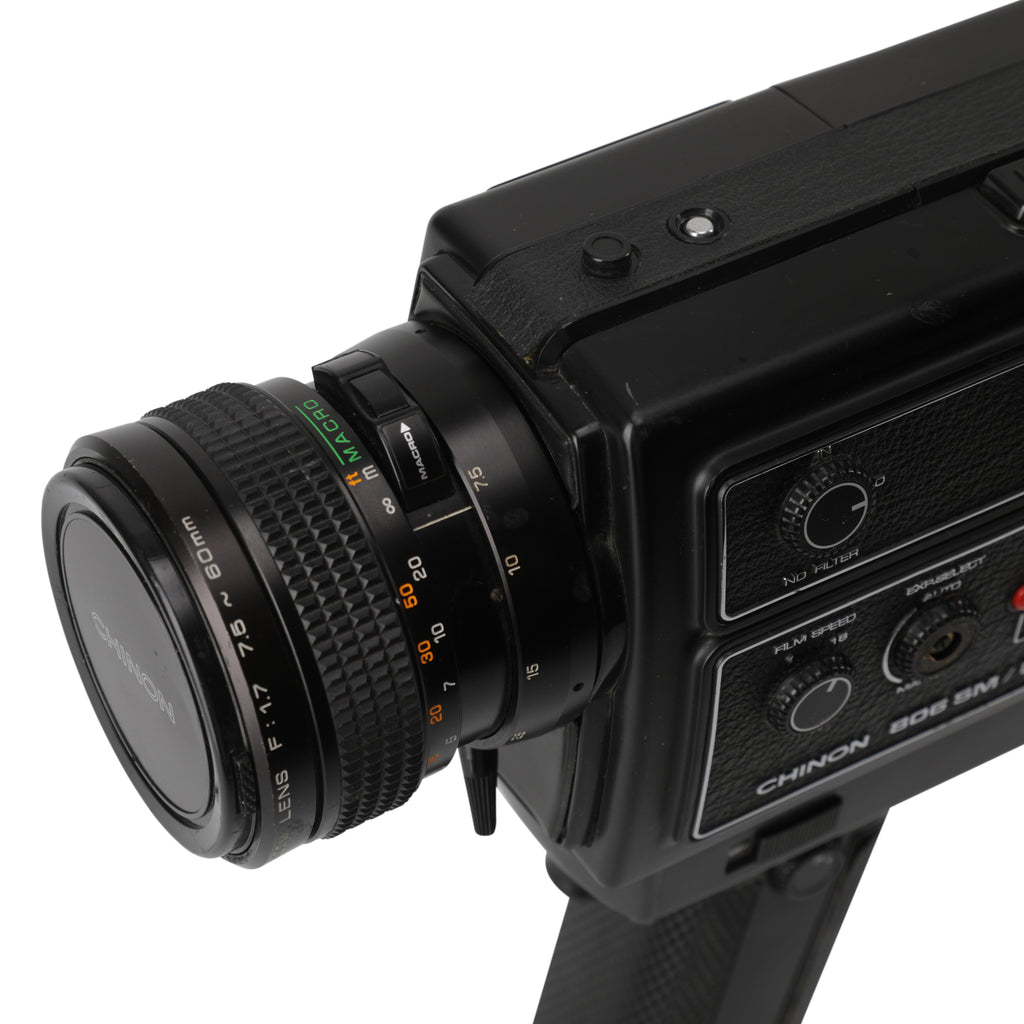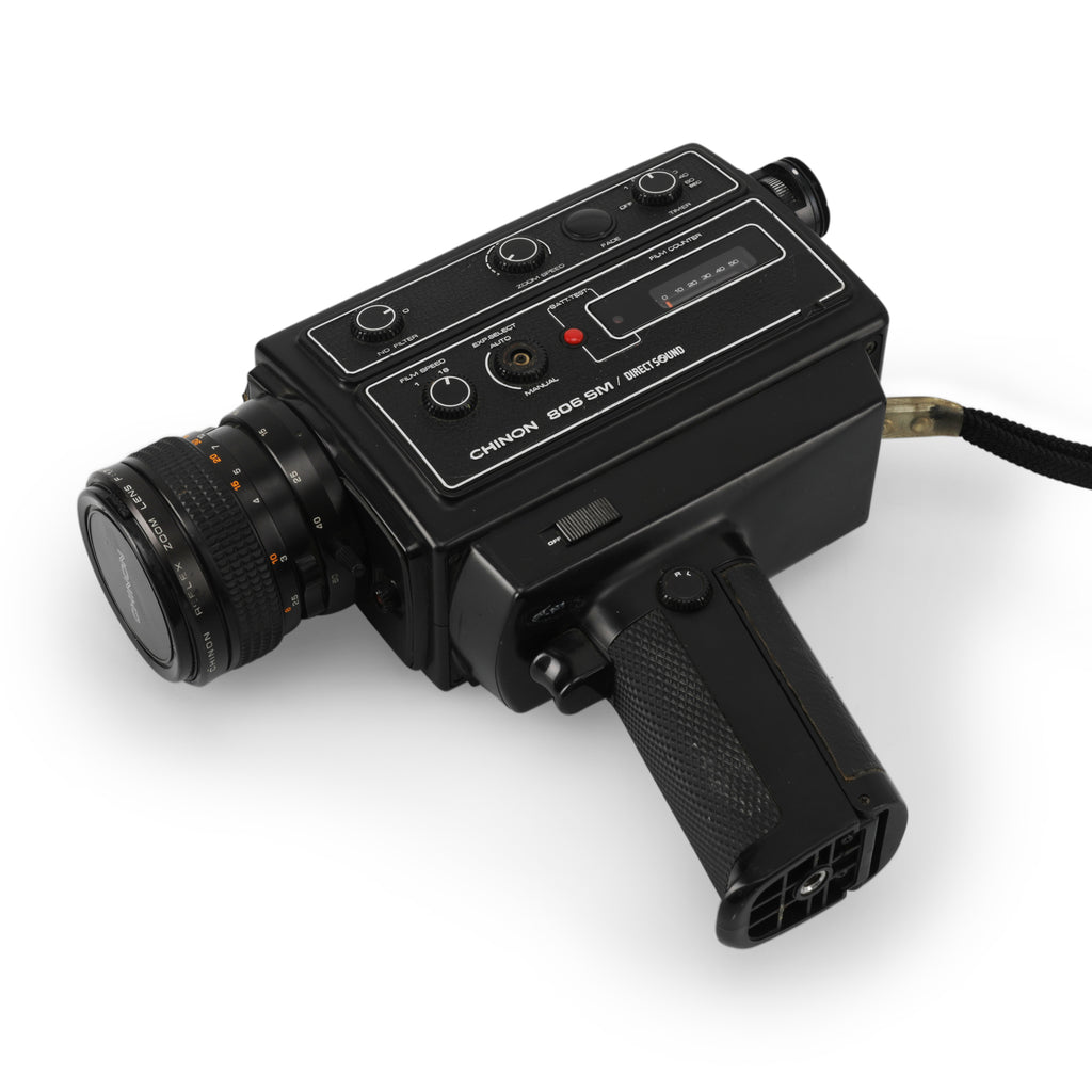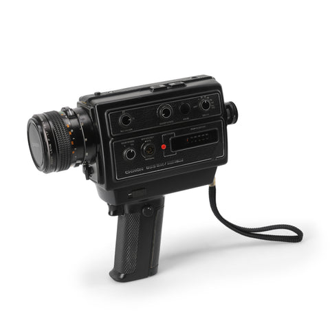 Details: Small vintage video camera with strap and pistol grip. Dimensions: 3" x 9" x 9"
