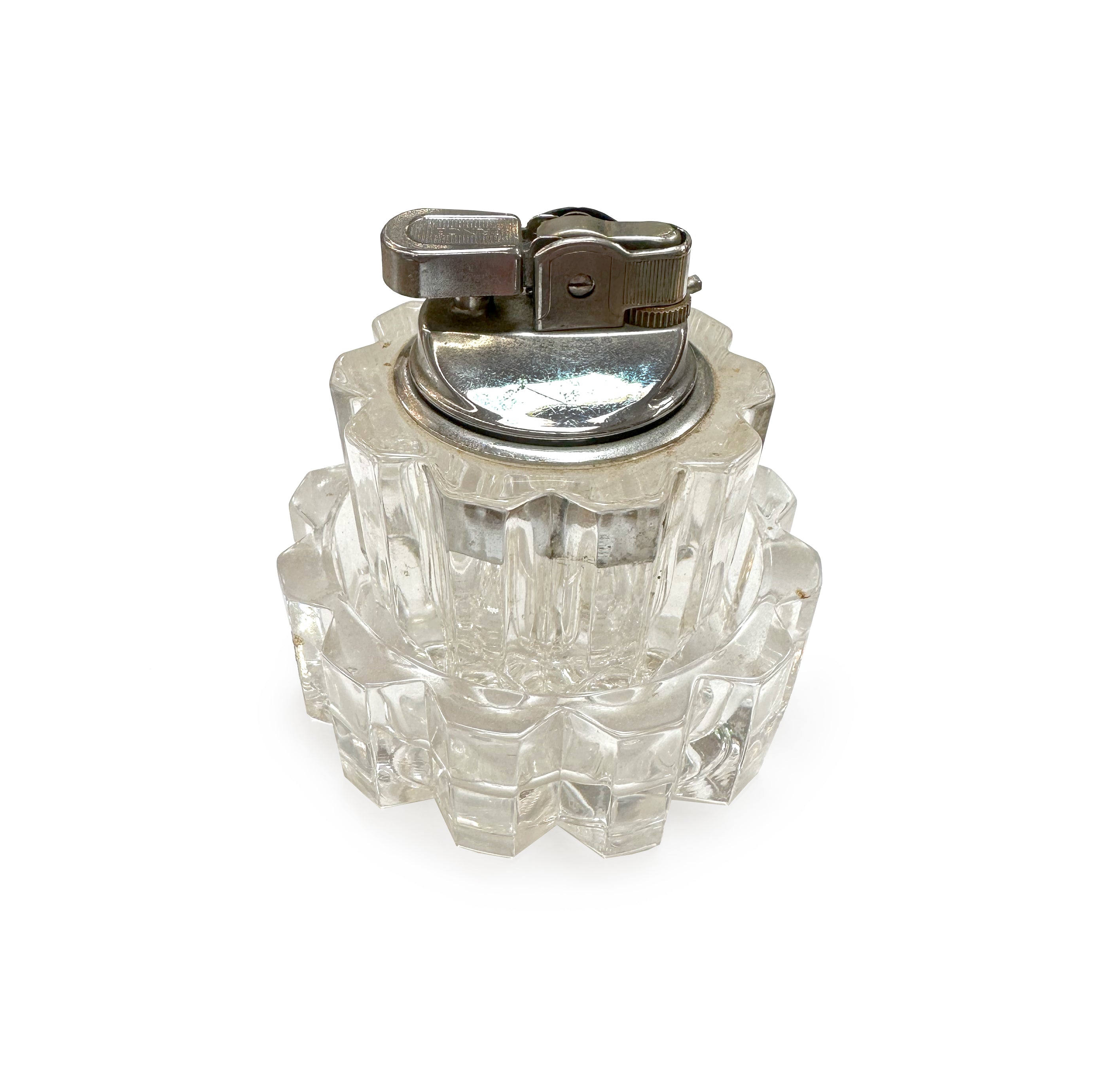 Details: 2-piece lighter / ashtray made of ribbed glass. Dimensions: 4" H x 3" W x 3" D