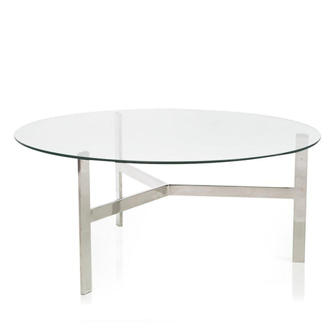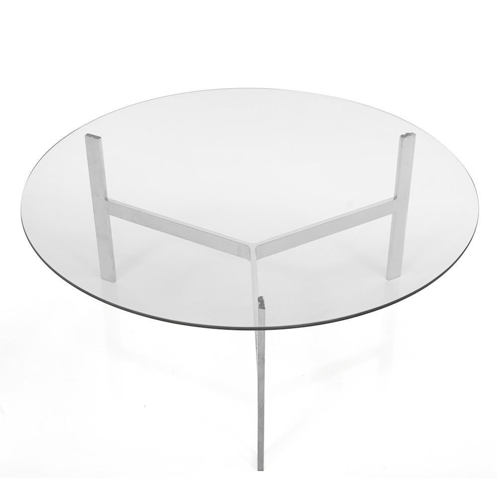 Details: Coffee table with round glass top and three-legged chrome stand Dimensions: 16" H x 36" W x 36" D