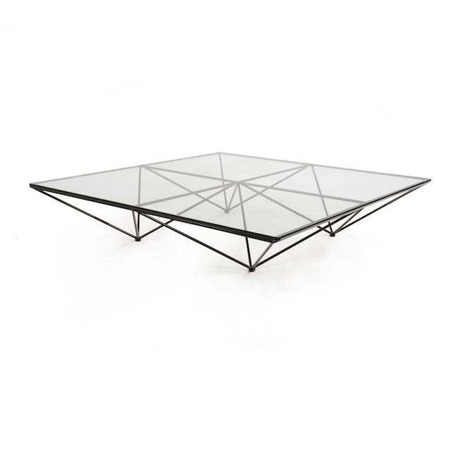 Details: Paolo Piva square coffee table with glass top and pyramid black metal base Dimensions: 10" H x 47" W x 47" D