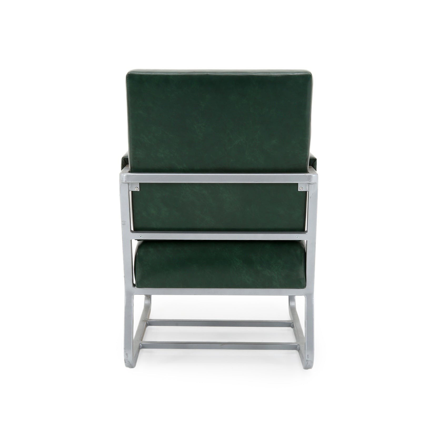 Details: Curved green futuristic lounge chair with rounded grey metal base. Piece is constructed of leather upholstery, with polished metal legs. Dimensions: 36" H x 88"...