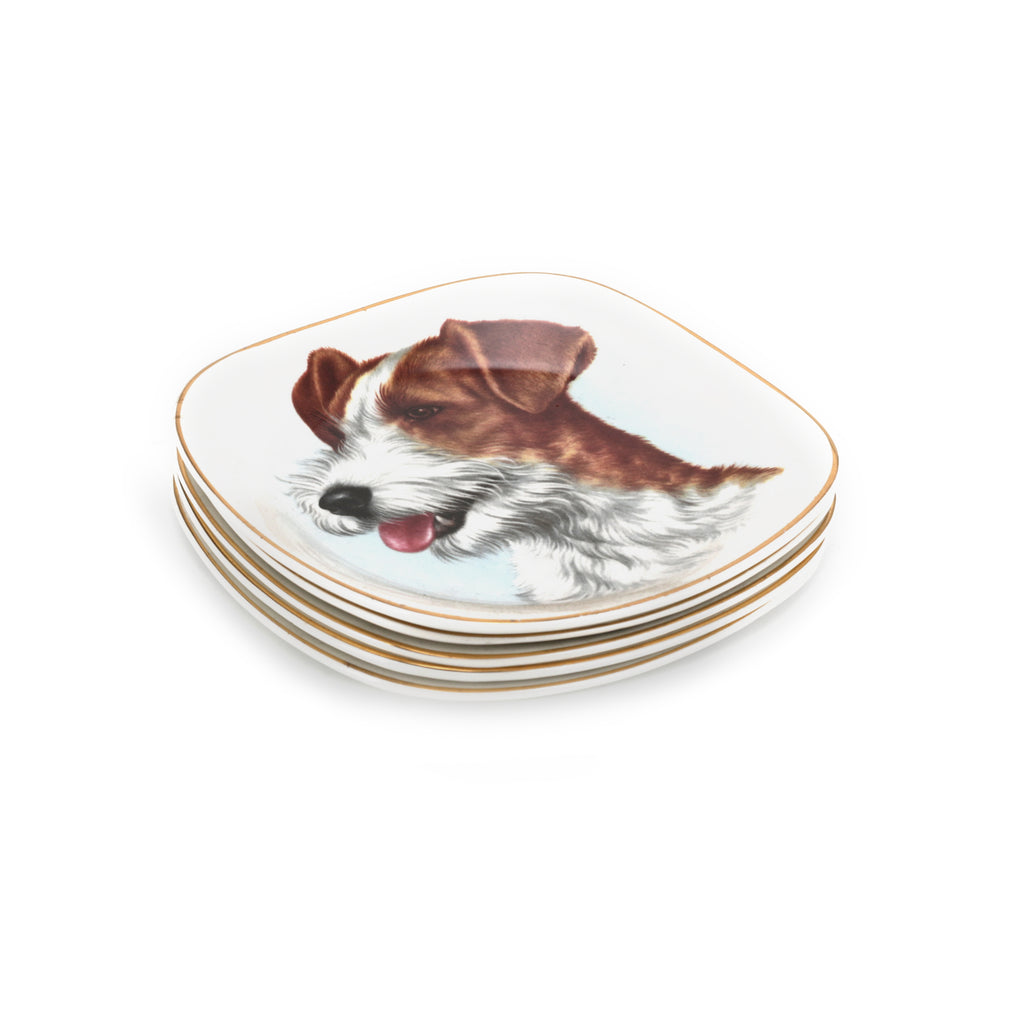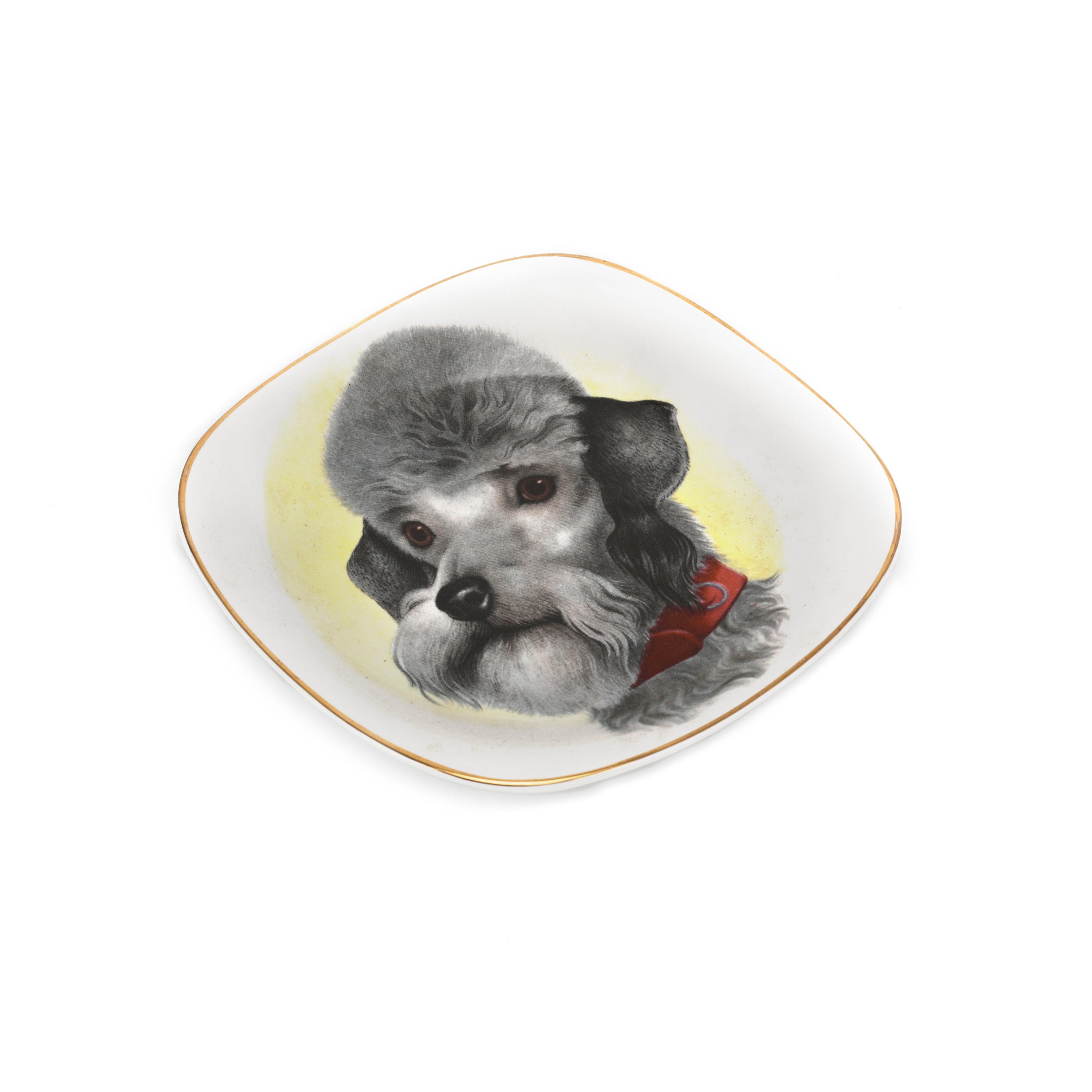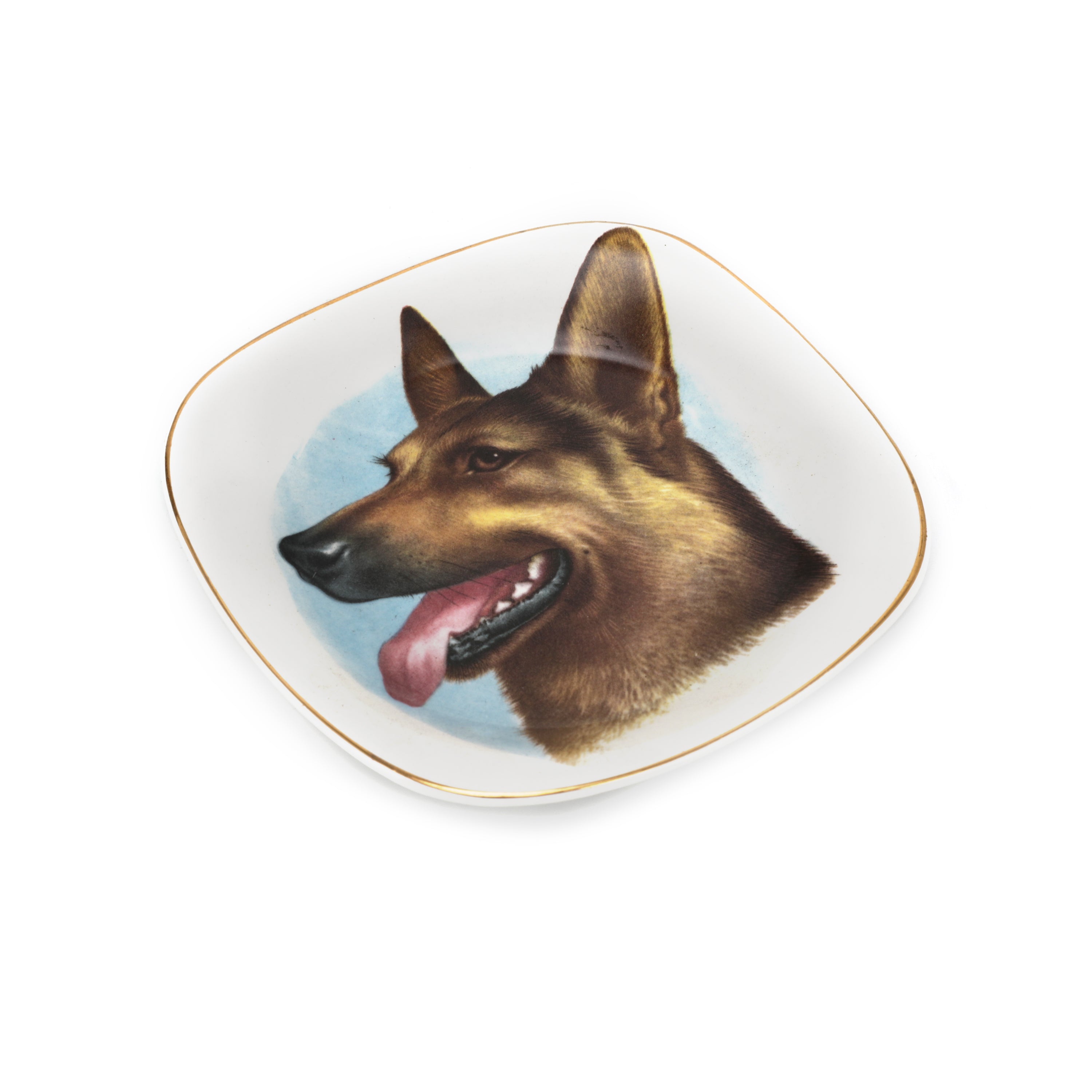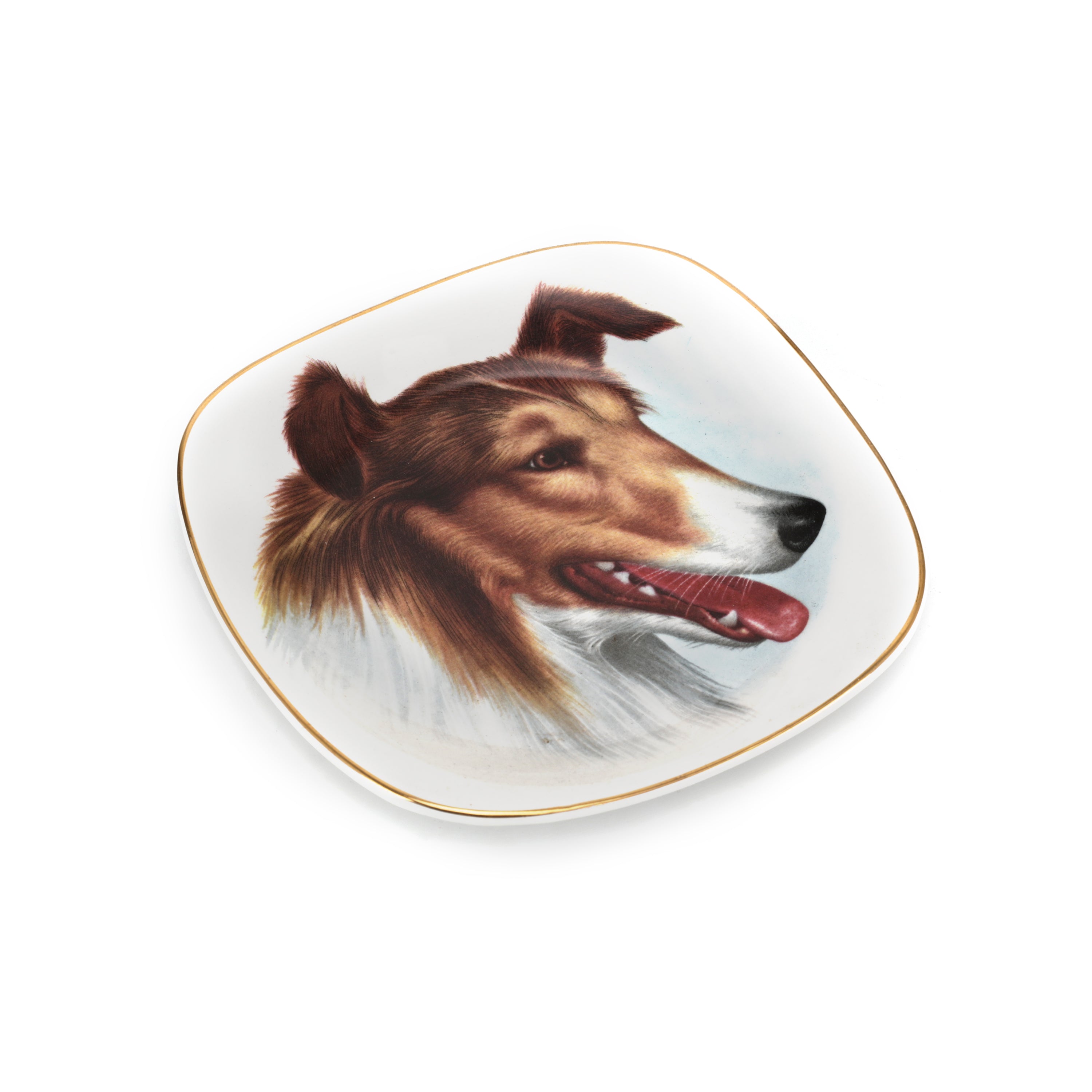 Details: Tan ceramic tile with painting of dog. Part of a set (priced per piece) Dimensions: 7" W x 5.5" L x 0.5" H