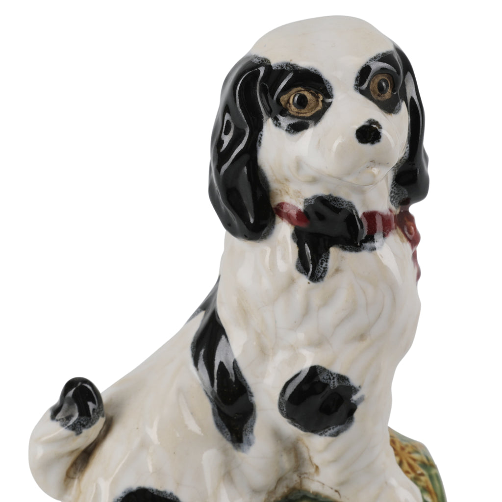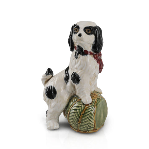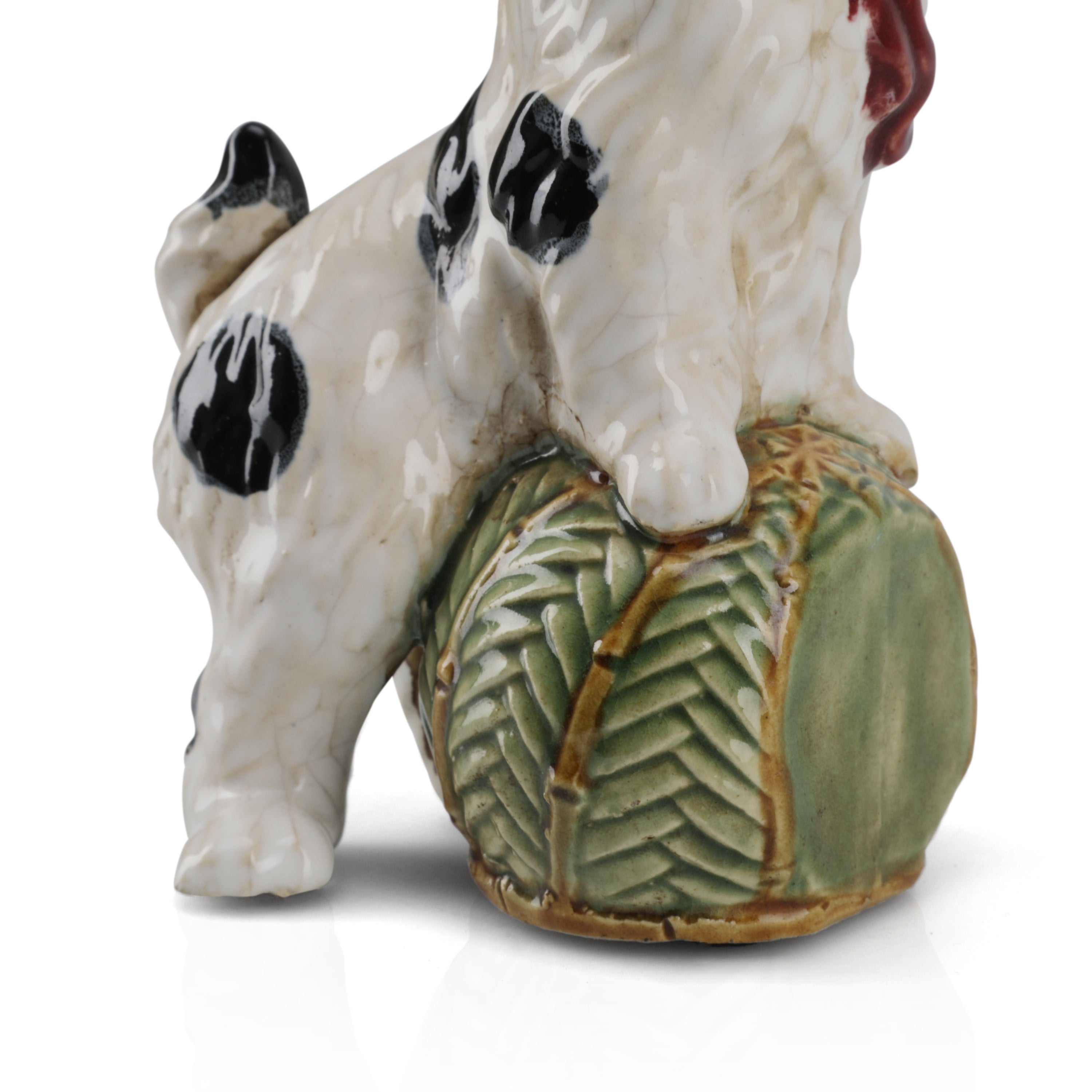 Details: Small ceramic black & white dog on a ball. Dimensions: 7.5" H x 4" W x 2" D