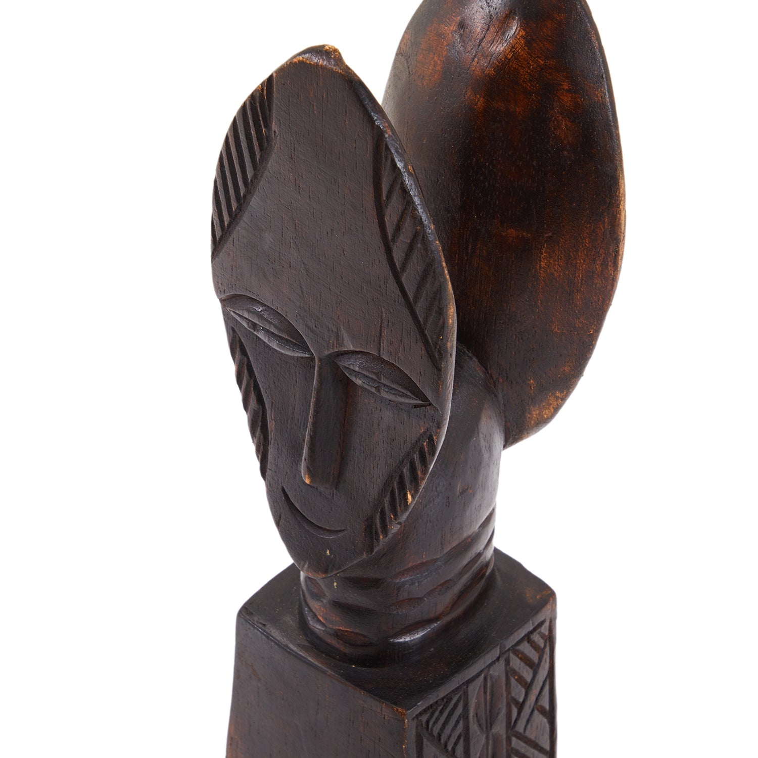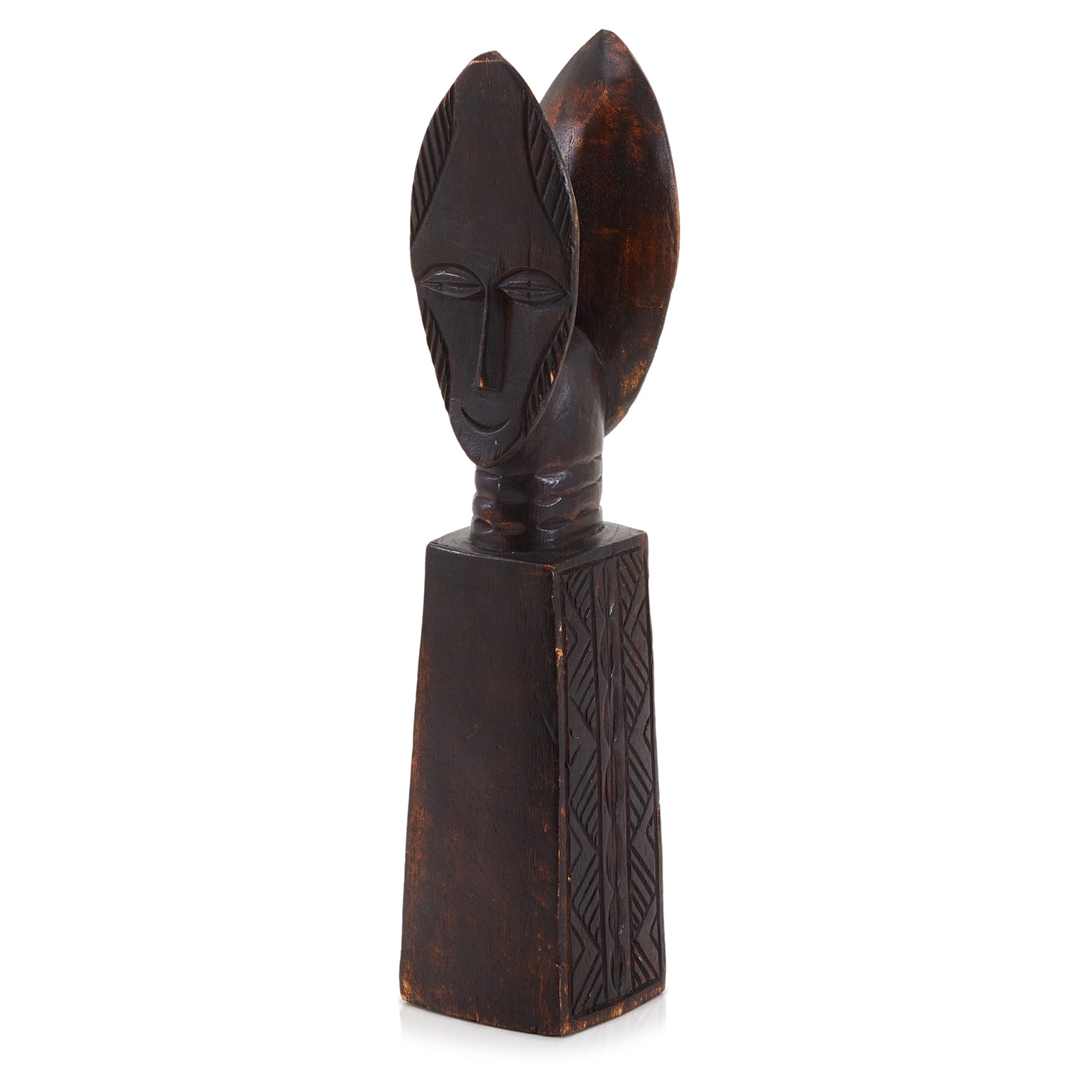 Details: Carved wooden bust sculpture with a tall, patterned base Dimensions: 16" H x 3" W x 3" D Quantity: 1