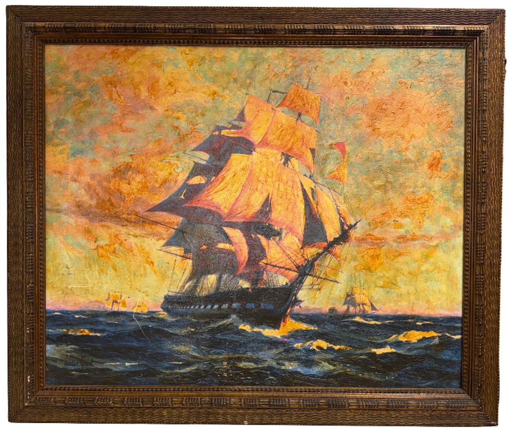 Details: Artwork of white birds flying in orange sunset. Dimensions: 48" W x 32" H