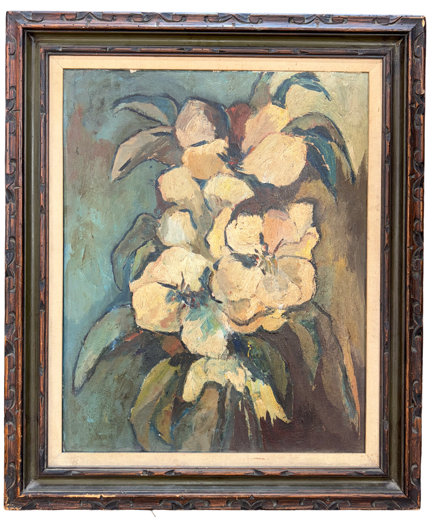 Details: Yellow flowers laden in a luminous muted background with a dark vignette. Printed on canvas in a black wood frame. Dimensions: 15" H x 10" W