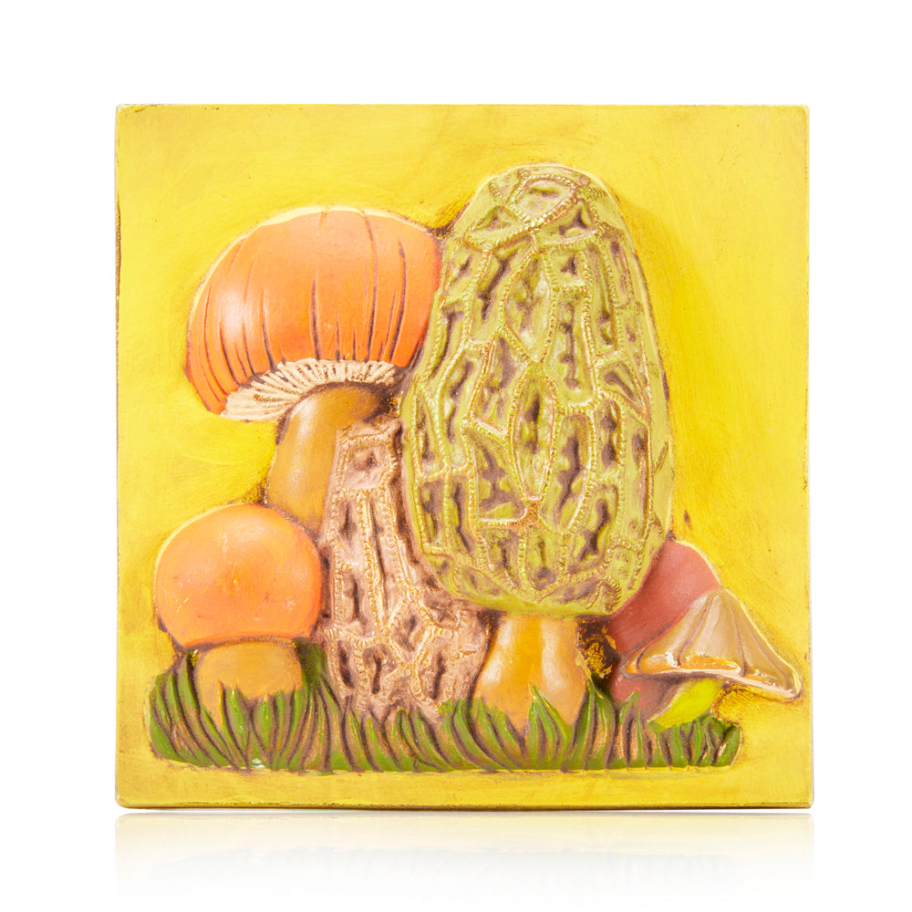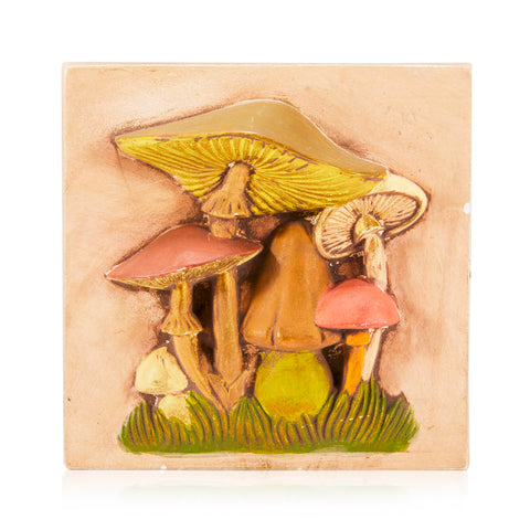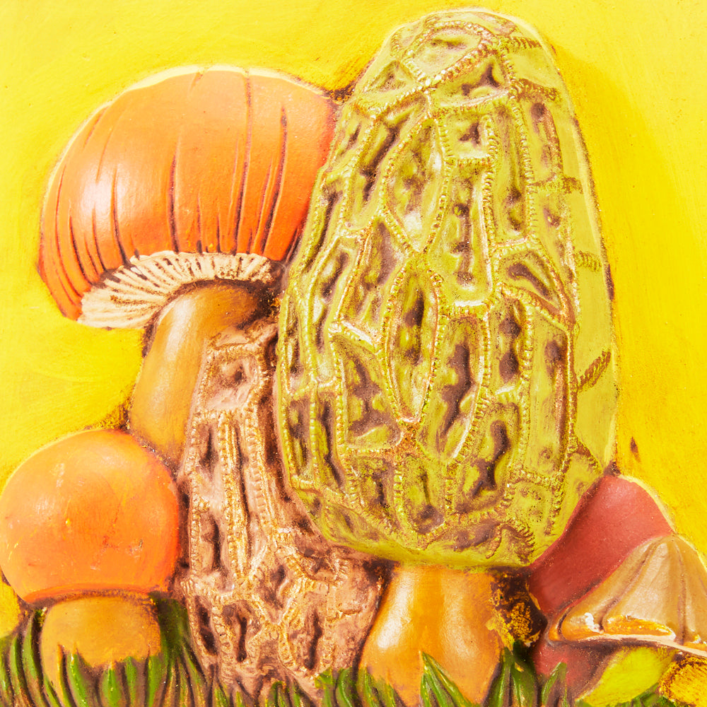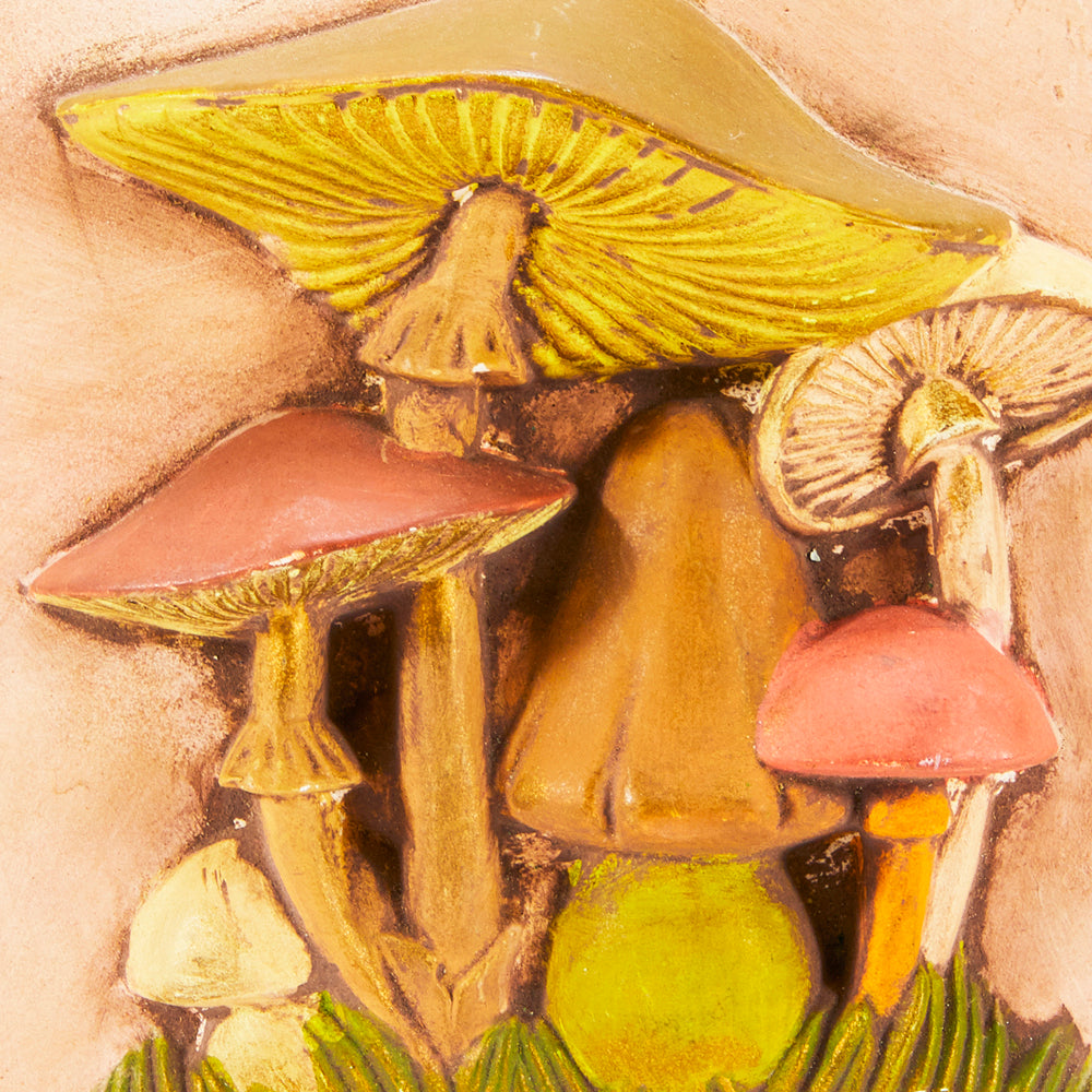Details: Psychedelic ceramic relief artwork depicting diverse multicolor mushrooms in grass
