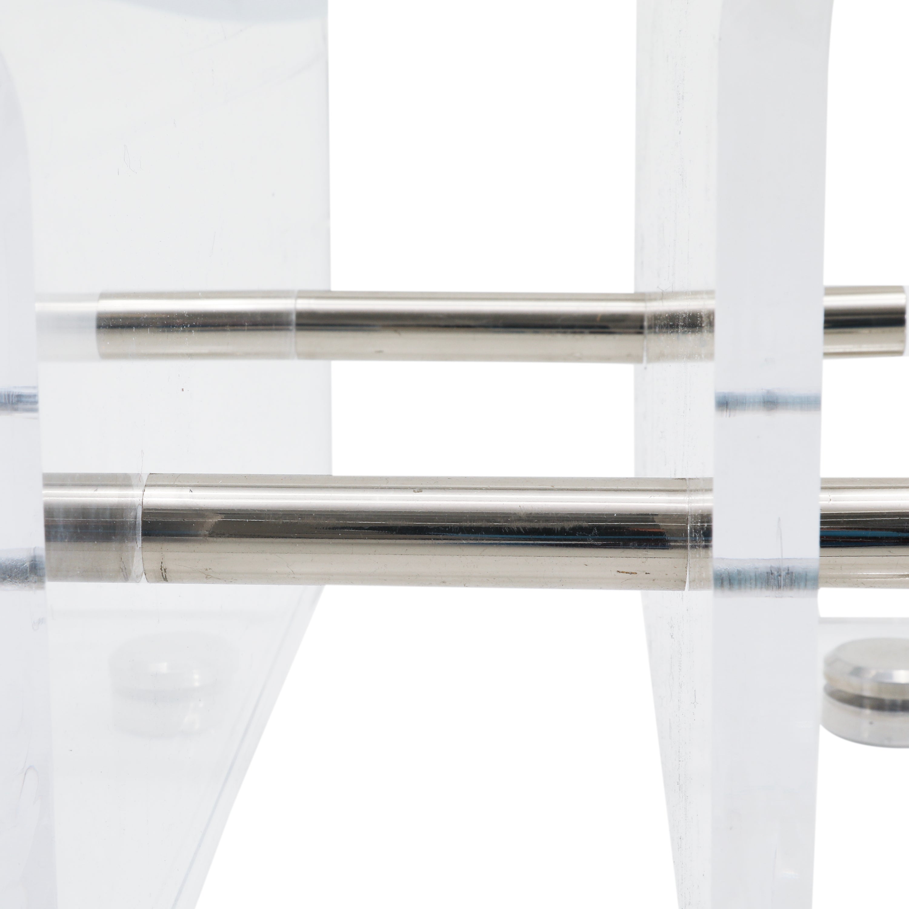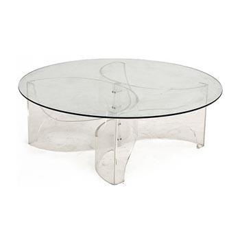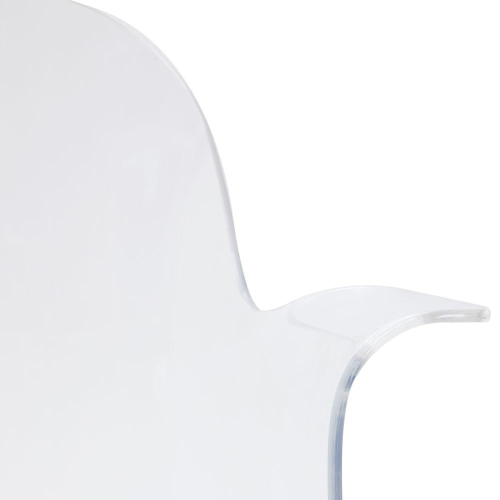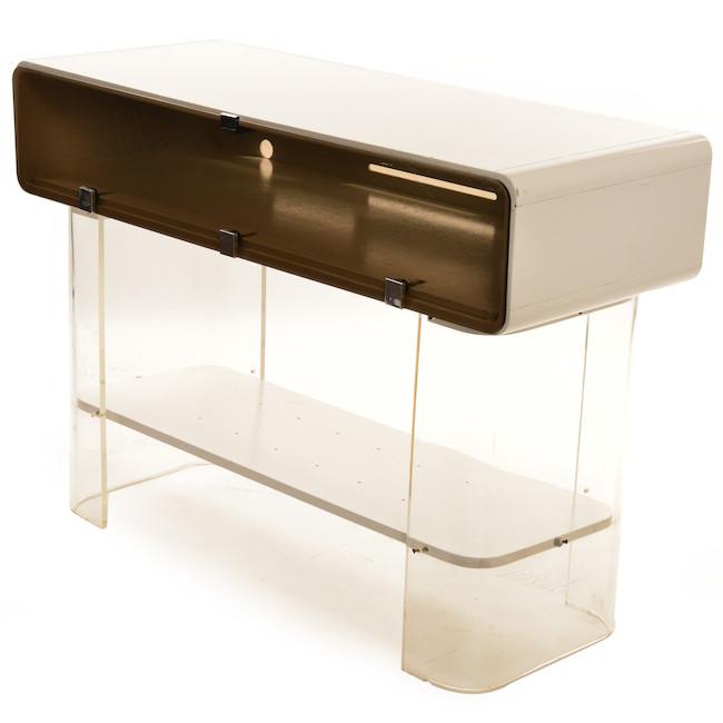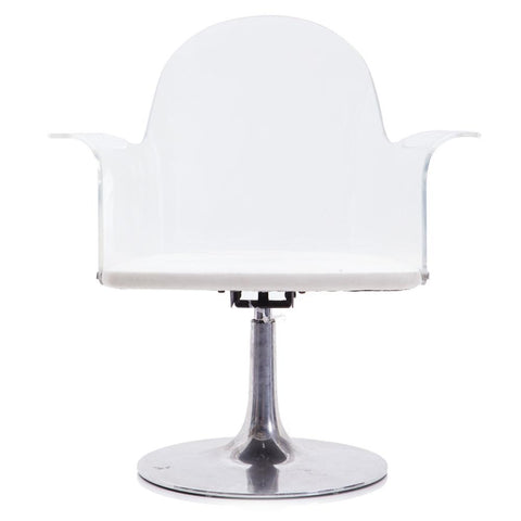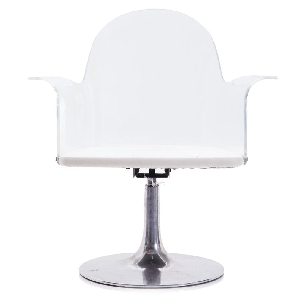 Details: Futuristic arm chair with grey leather upholstery, white plastic shell, and clear base. (Vintage piece with high replacement value) Dimensions: 25" H x 41" W x...