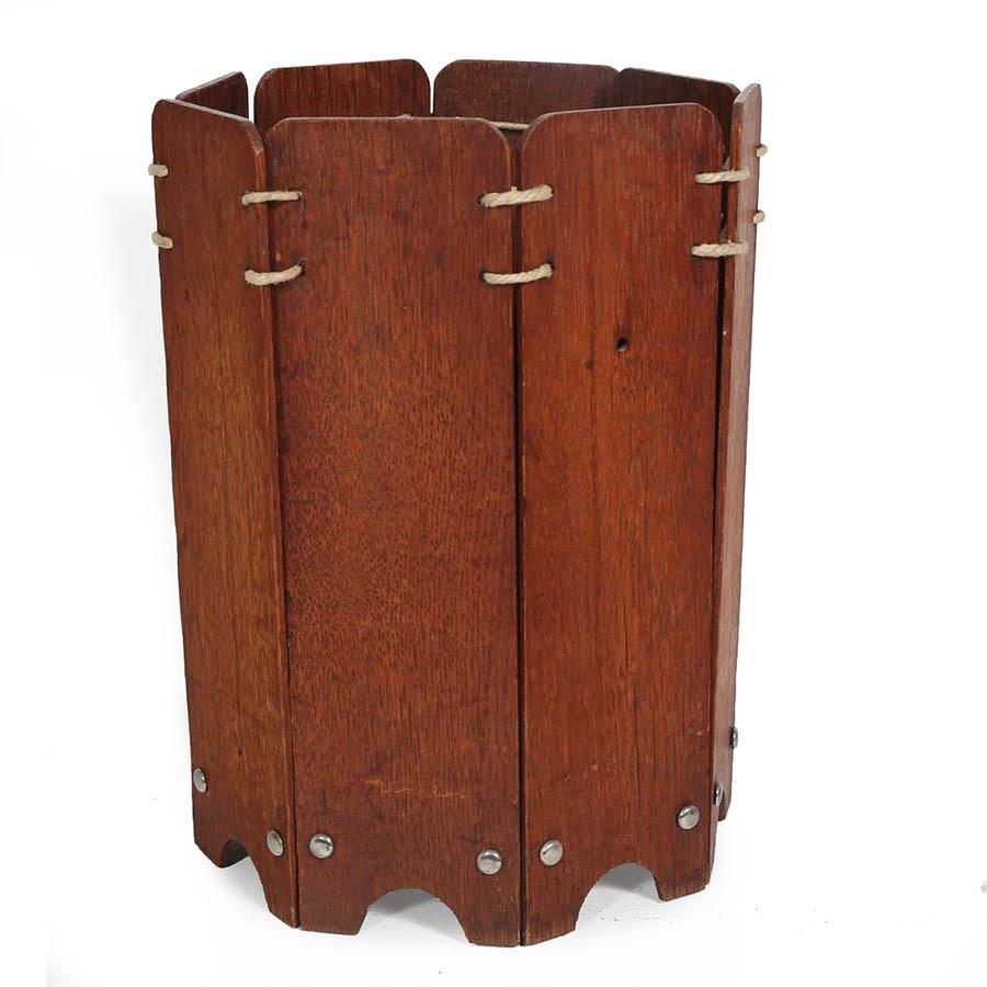 Details: Dark Wood, Rope, Trash Can, Small Dimensions: 15" X 10" Diameter