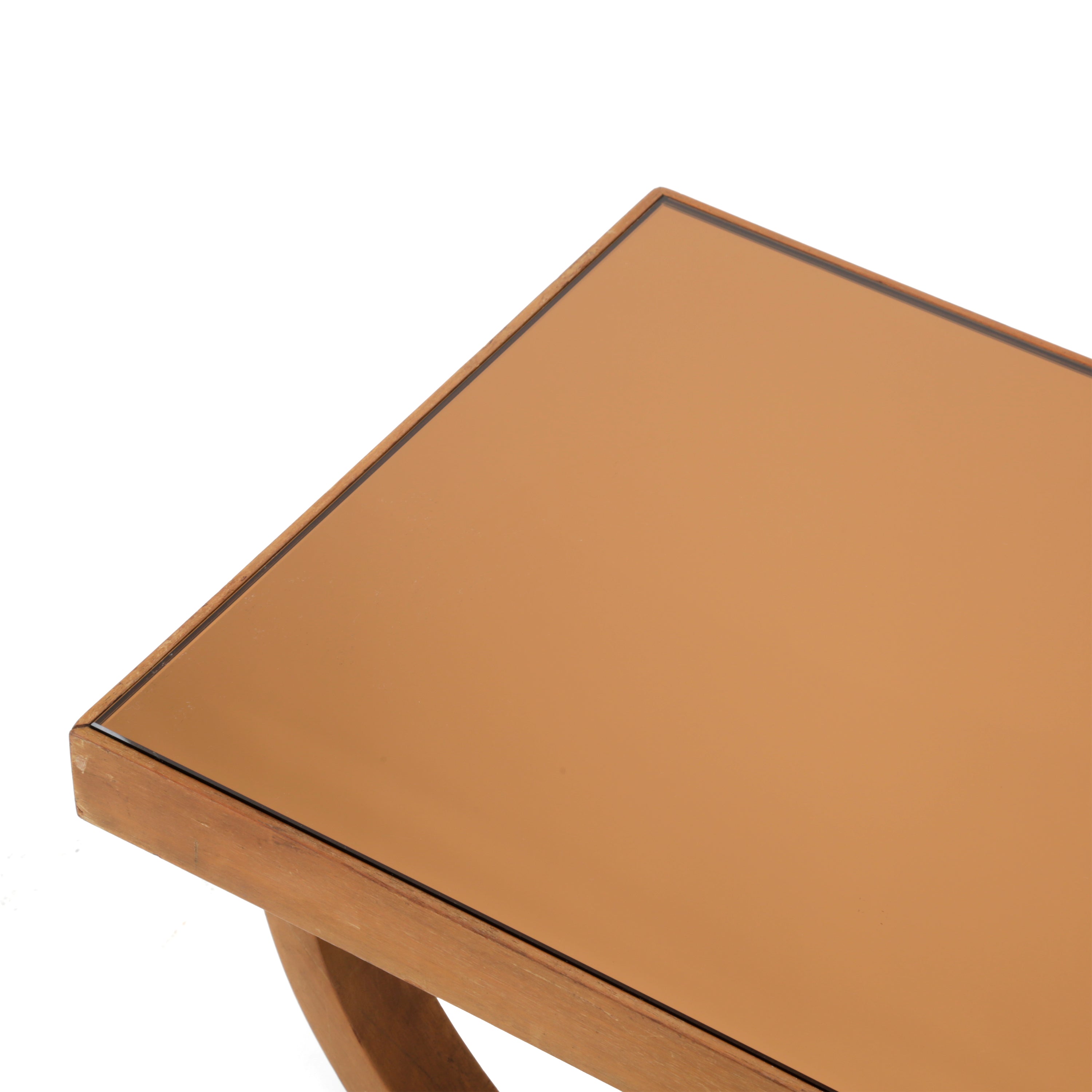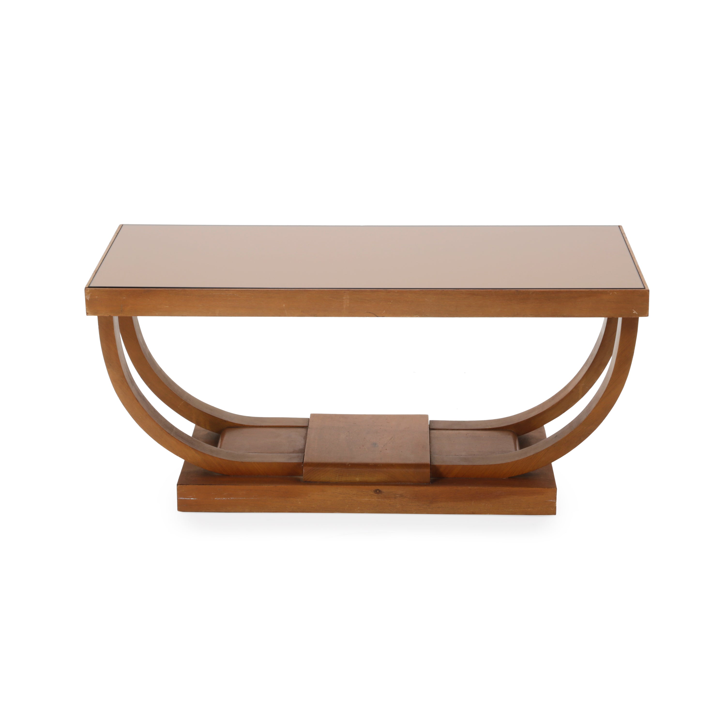 Details: Wooden coffee table with crescent frame and glass top. Dimensions: 15.5" H x 34" W x 16" D