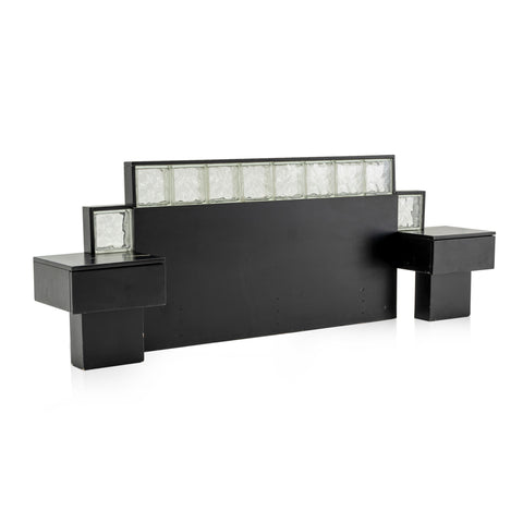 Details: Geometric black painted wood headboard with glass cube border, with attached black 1-drawer side tables on both sides Dimensions: 35.5" H x 100" W...