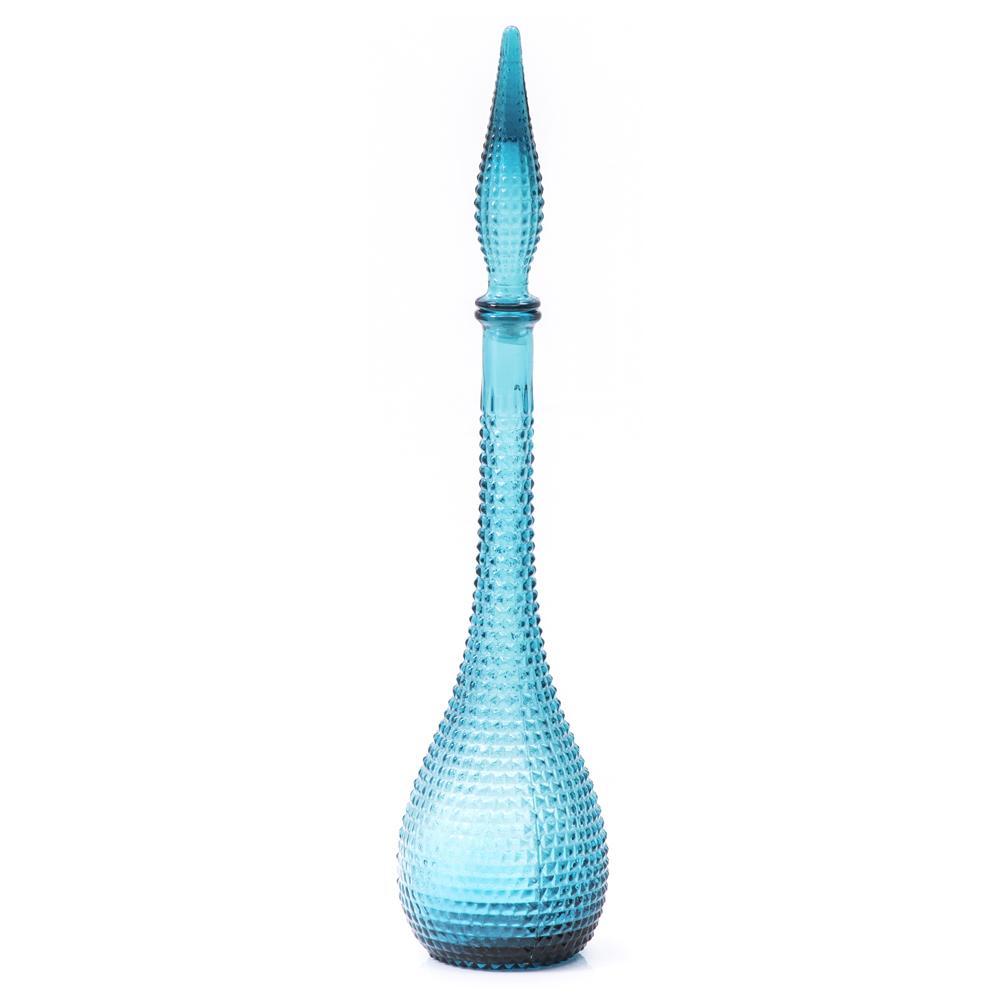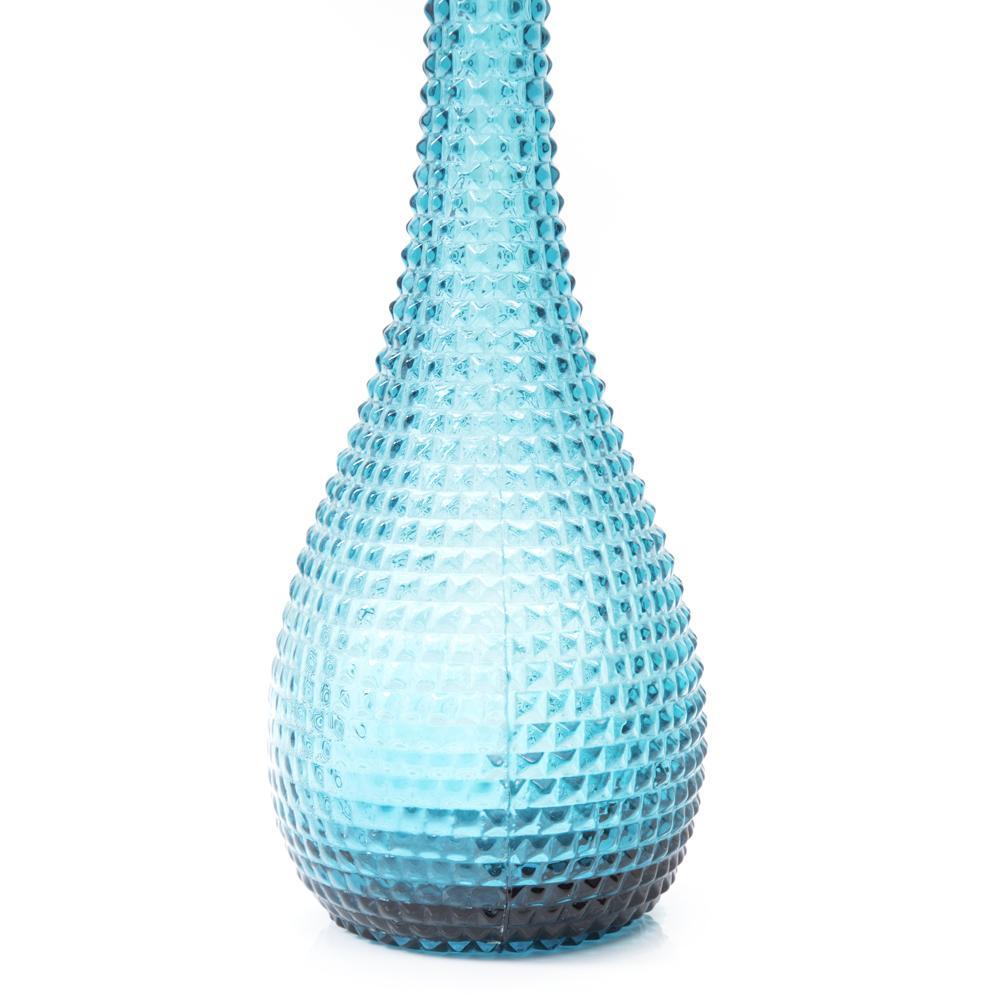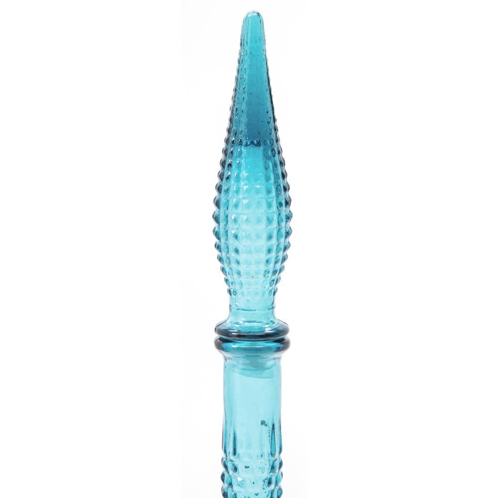 Details: Blue Cut Glass Teardrop Vase/Decanter with Pointy Stopper Dimensions: 20" H x 4.5" W x 4.5" D Quantity: 1