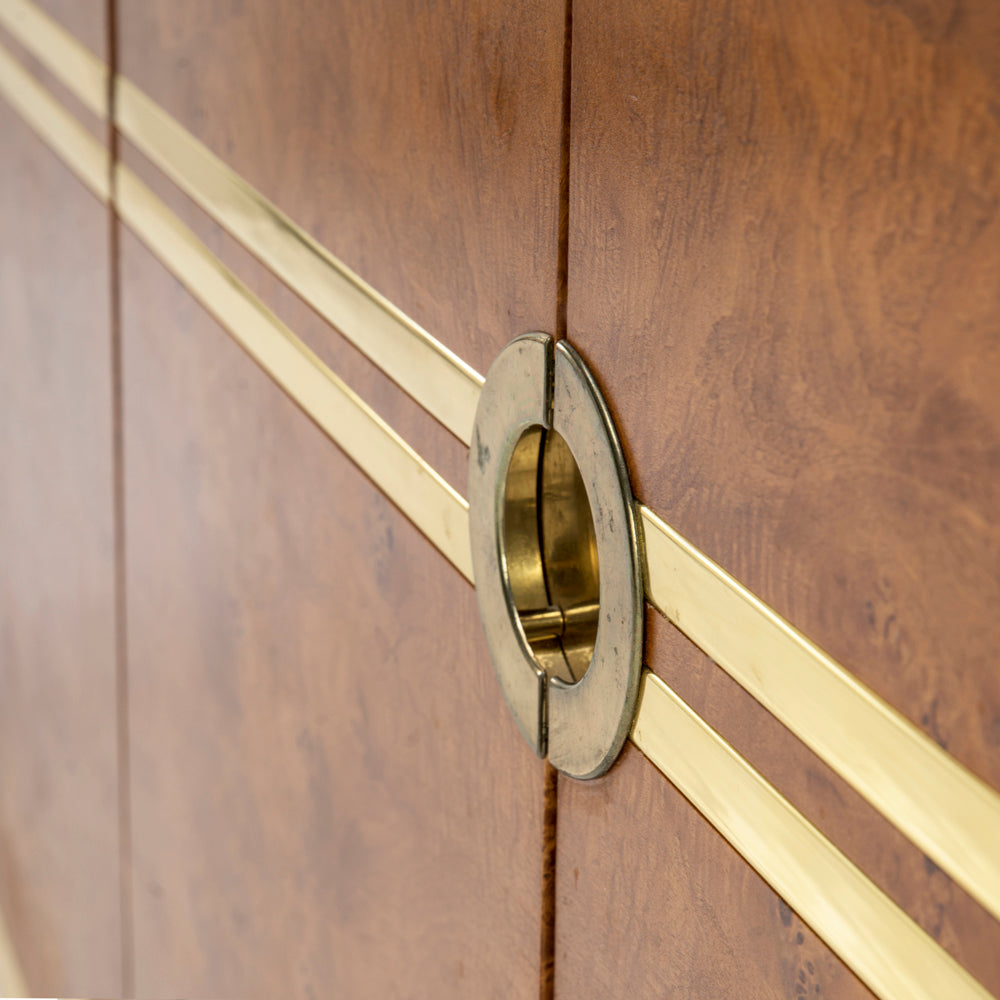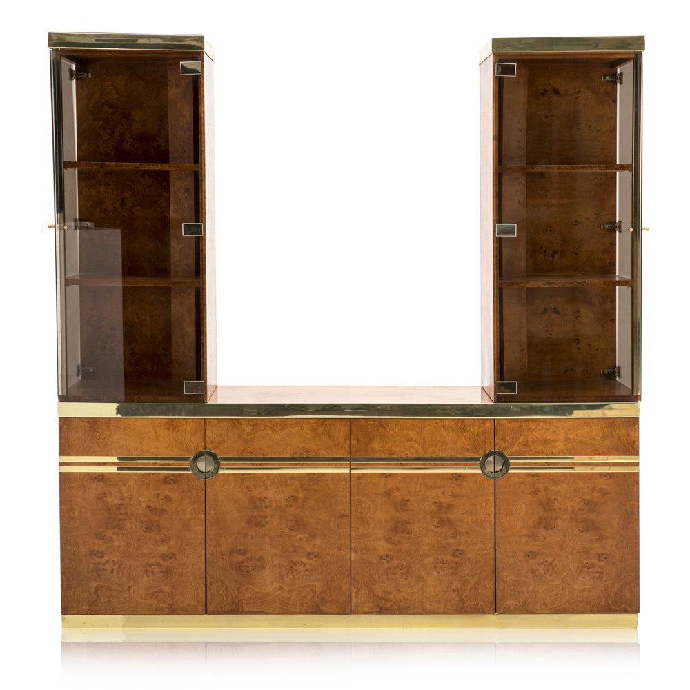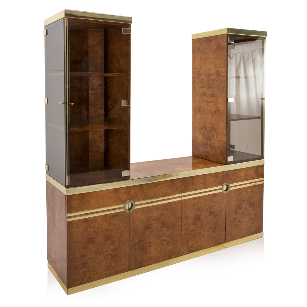 Details: Rare contemporary shelving unit with chrome arch and oak backing. A matching left side is available to rent separately. (Handle with care. Item has since...