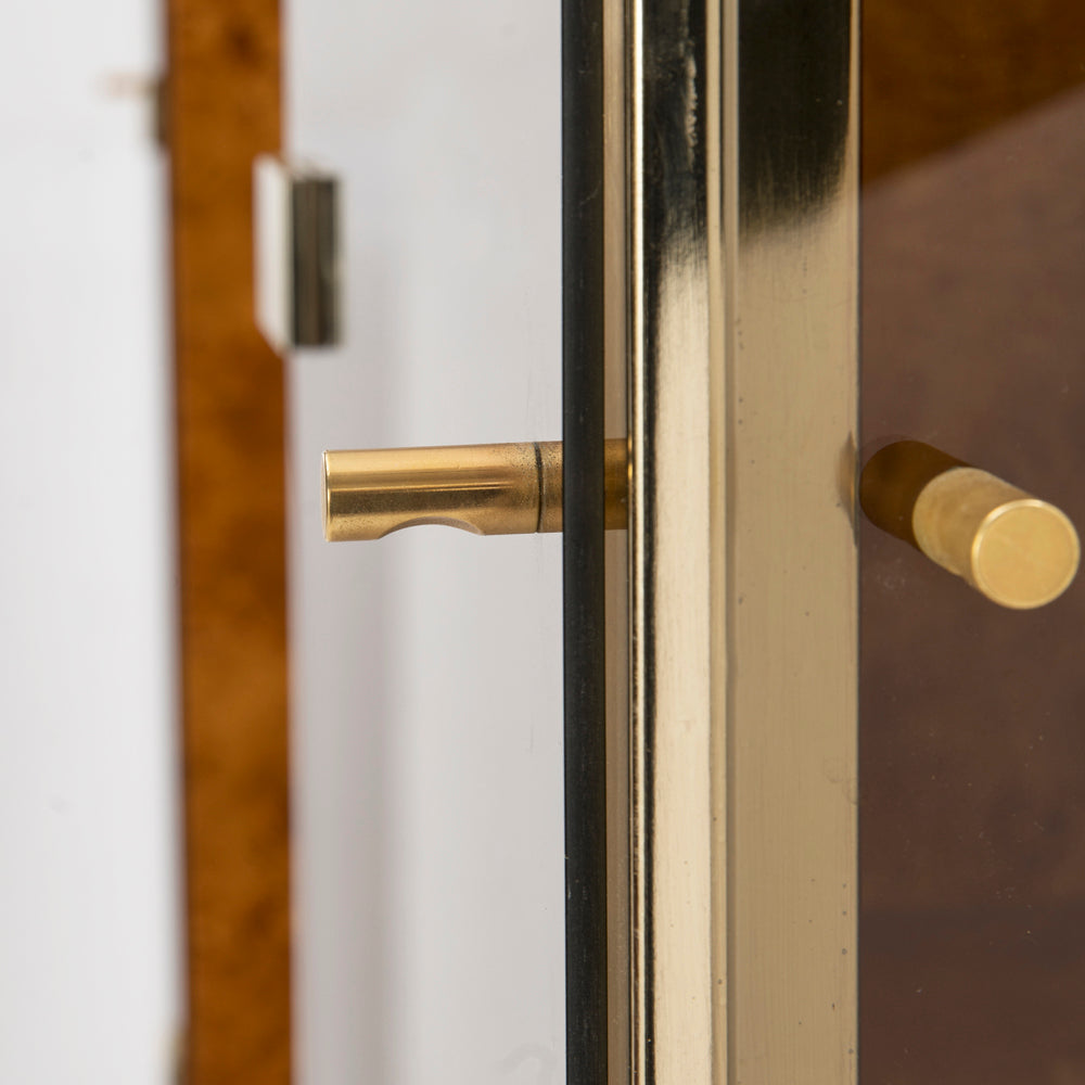 Details: Rare contemporary shelving unit with chrome arch and oak backing. A matching right side is available to rent separately. (Handle with care. Item has...