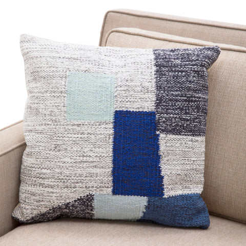 Details: Square knit pillow with monochromatic geometric blue squares Dimensions: 8" H x 8" W x 3" D Quantity: 1