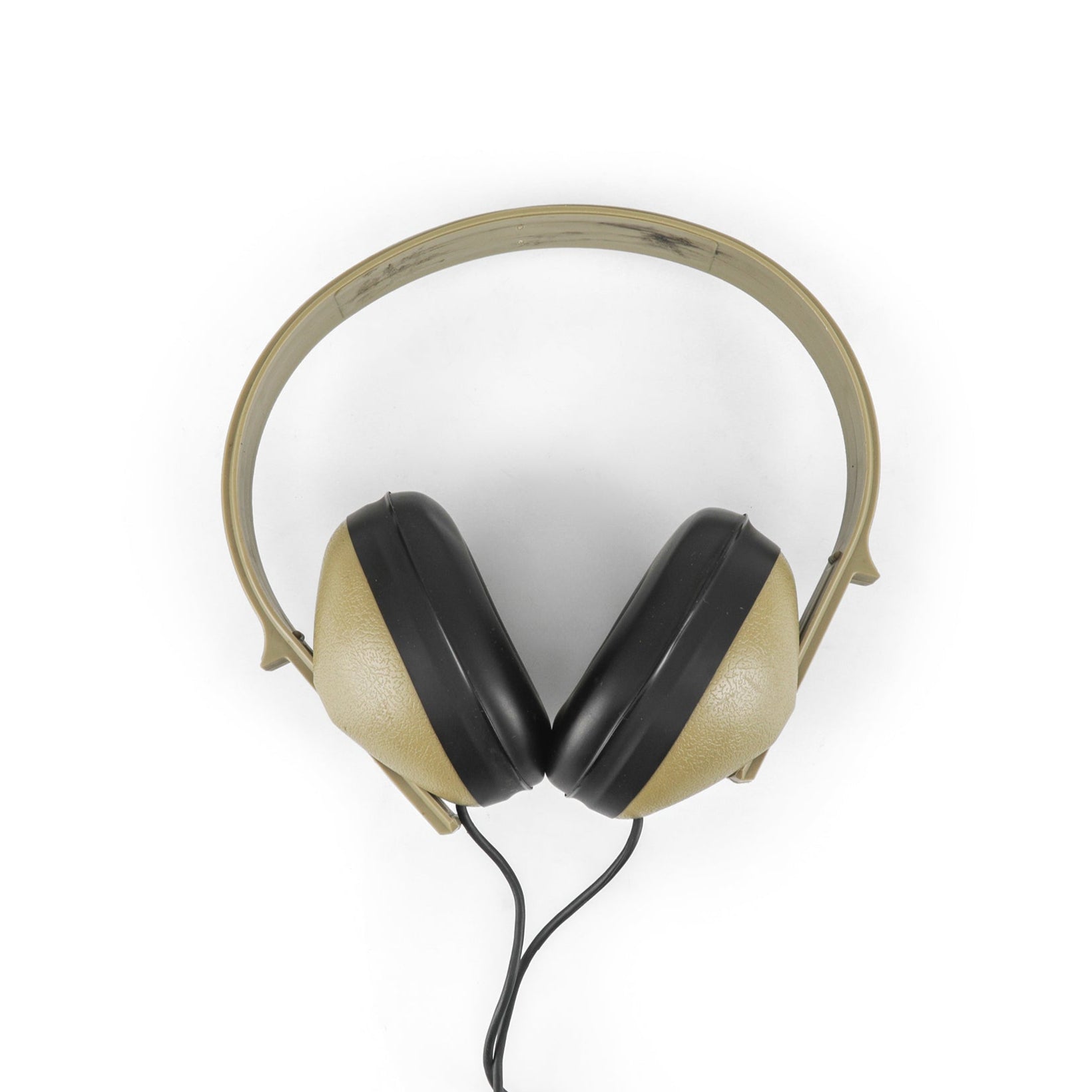 Details: Vintage headphones with black ear pads and hard acrylic shell. Dimensions: 9" H x 9" W x 3.5" D